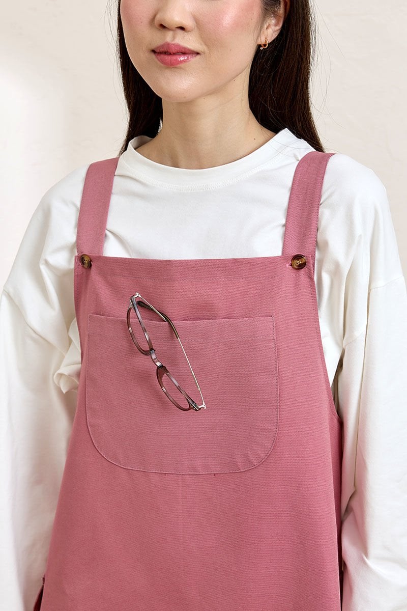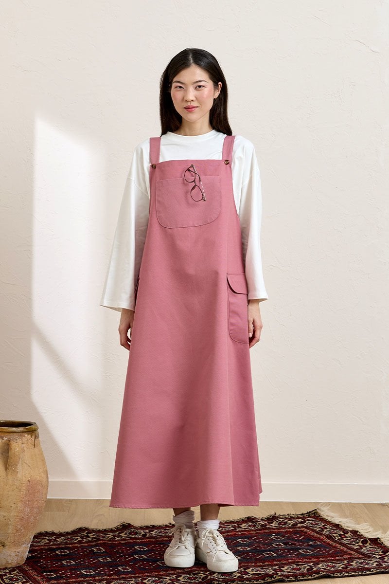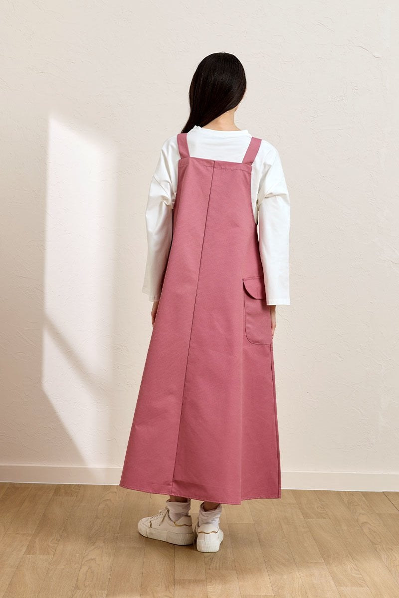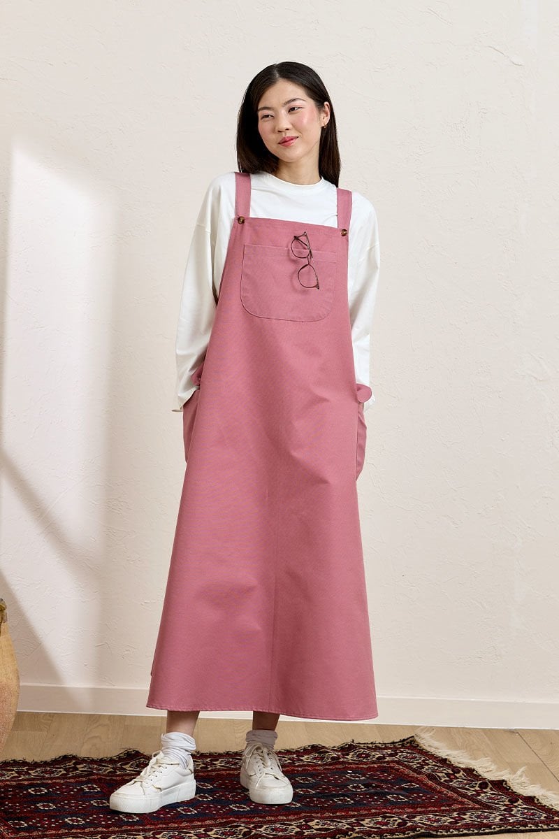 Bu pembe keten etekli salopet, şıklığı ve rahatlığı bir arada sunuyor.