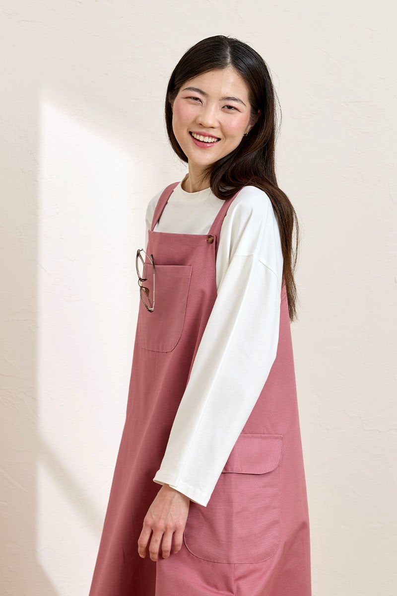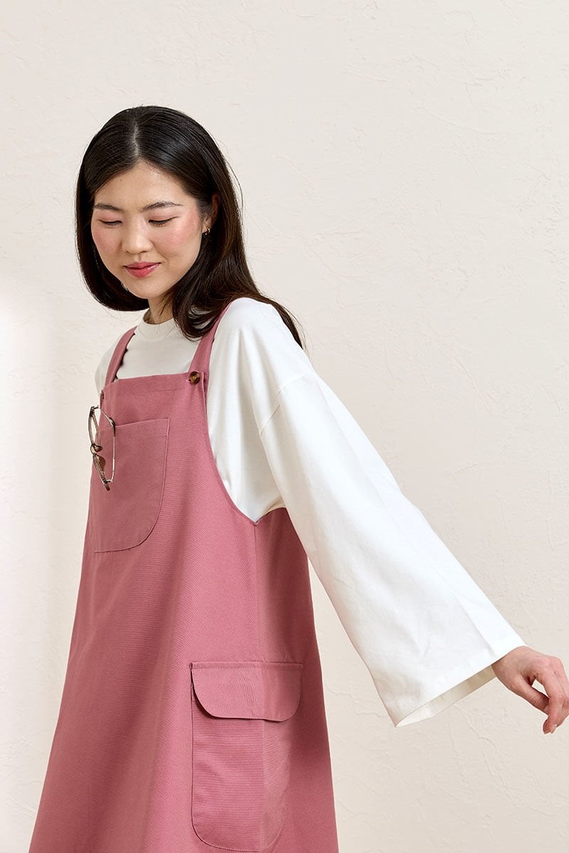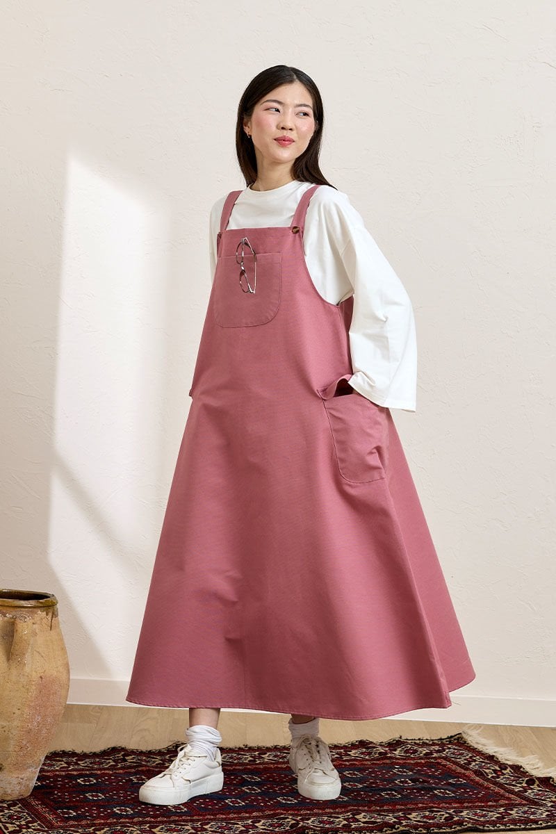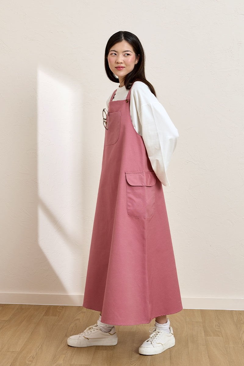Bu pembe keten etekli salopet, şıklığı ve rahatlığı bir arada sunuyor.