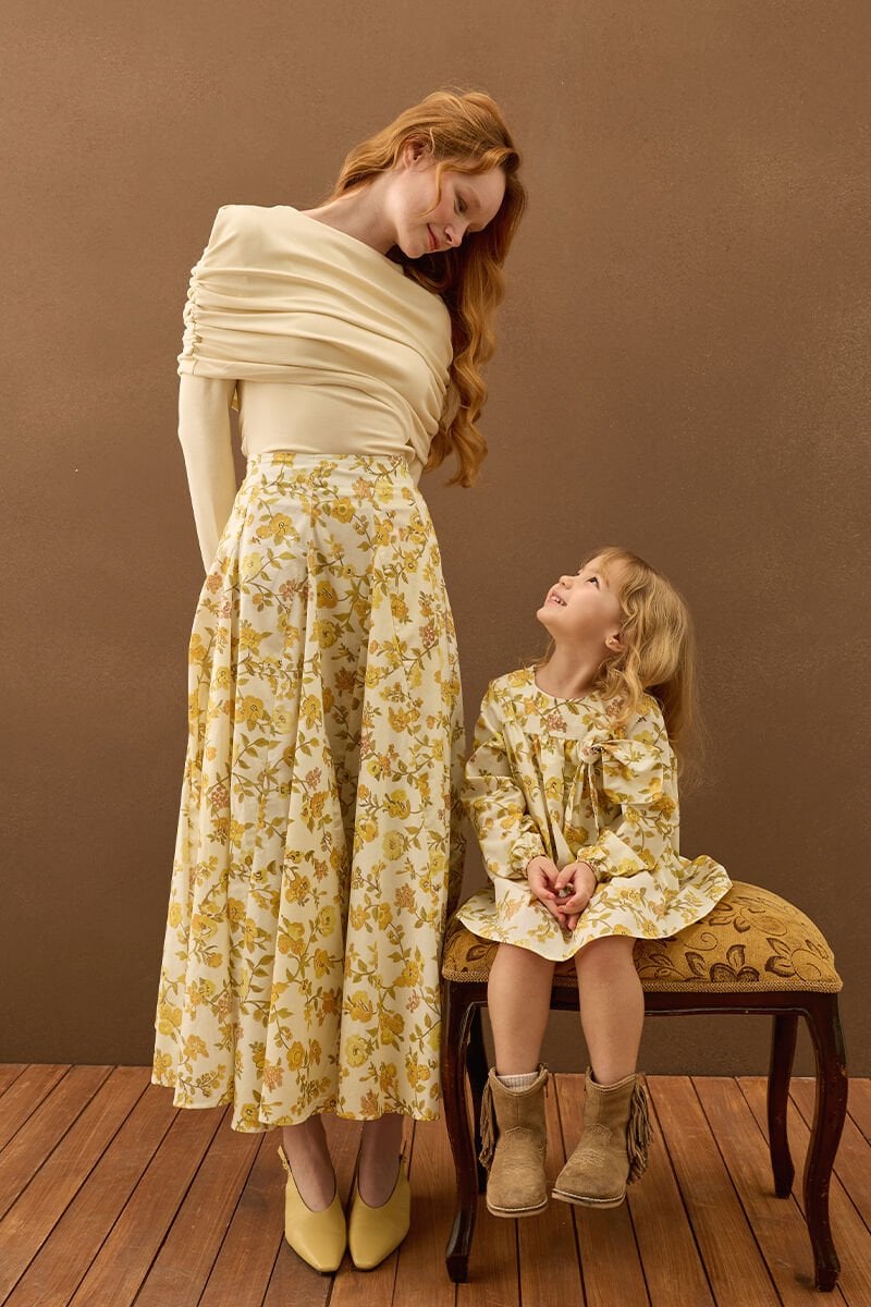 Sarı Çiçek Detaylı Çocuk Elbise & Krem Oysho Büzgü Detaylı Bluz & Sarı Çiçek Desenli Parçalı Etek Takım