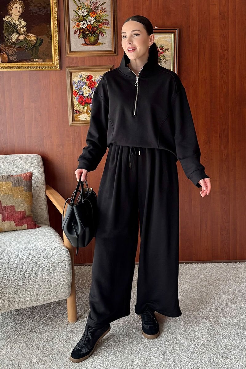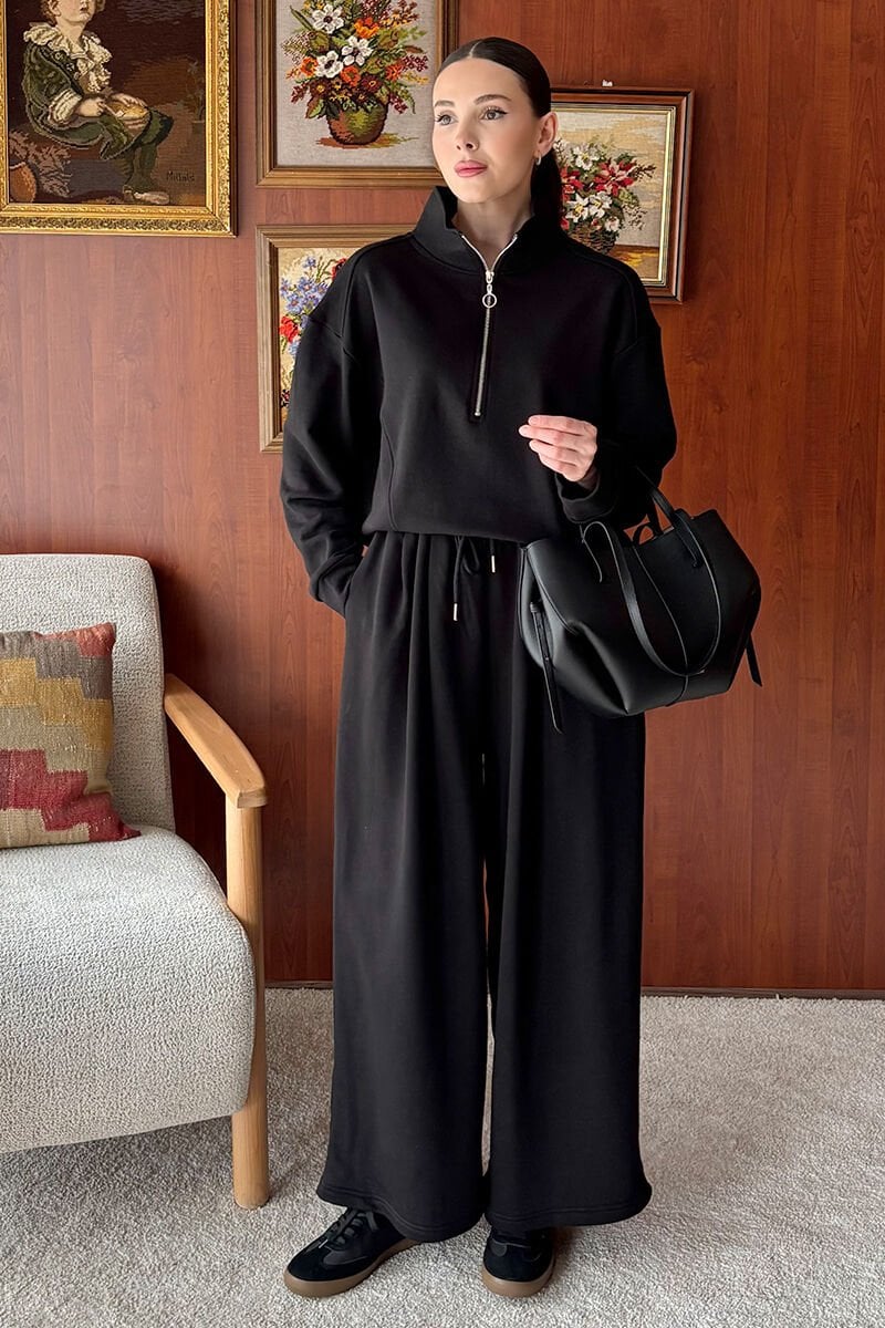 Siyah 3 İplik Yarım Fermuarlı Eşofman Takım