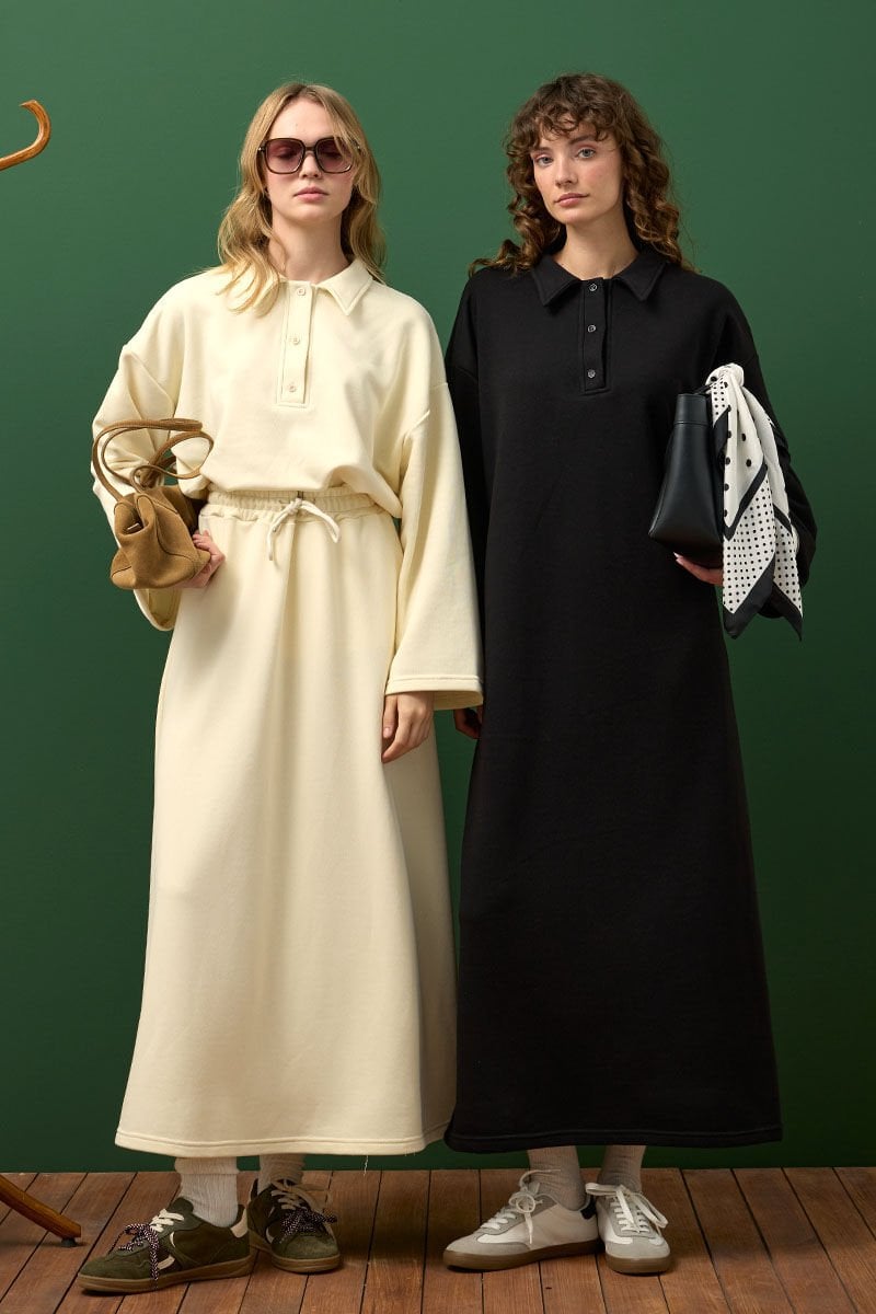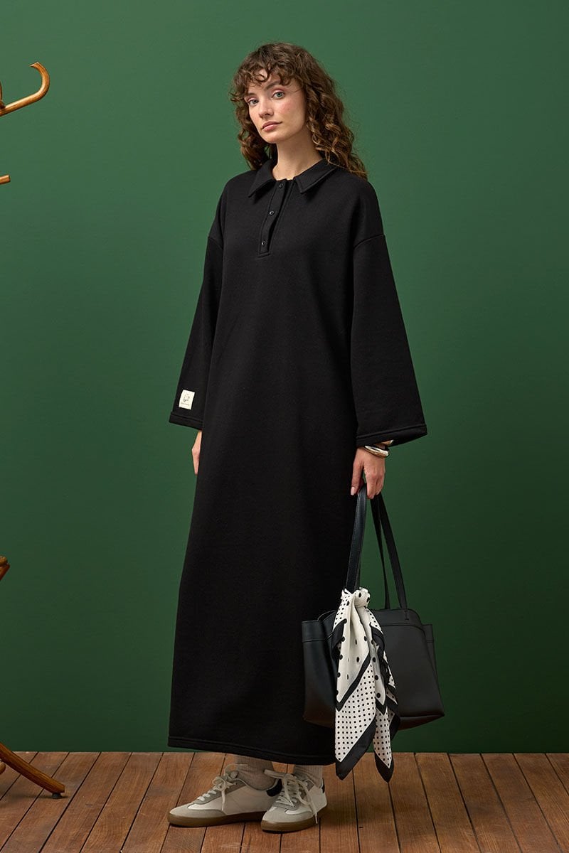 Bu şık ve rahat 3 iplik polo yaka uzun elbise, her an için harika bir seçenek.