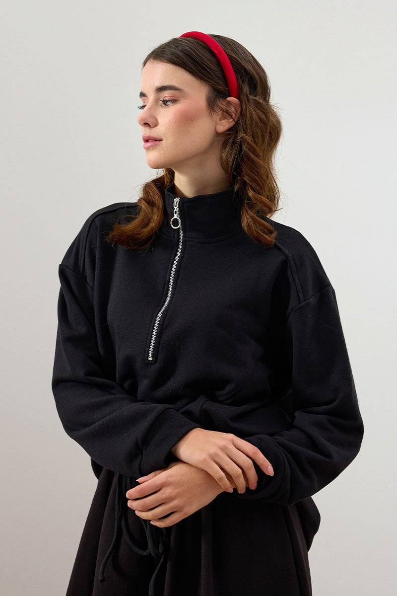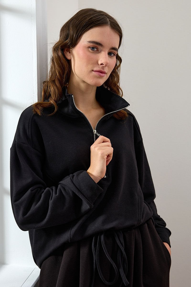 Siyah 3 İplik Yarım Fermuarlı Sweat