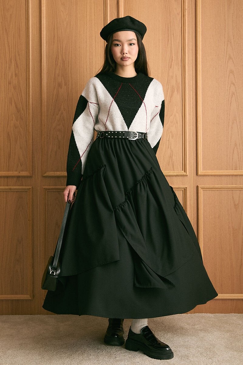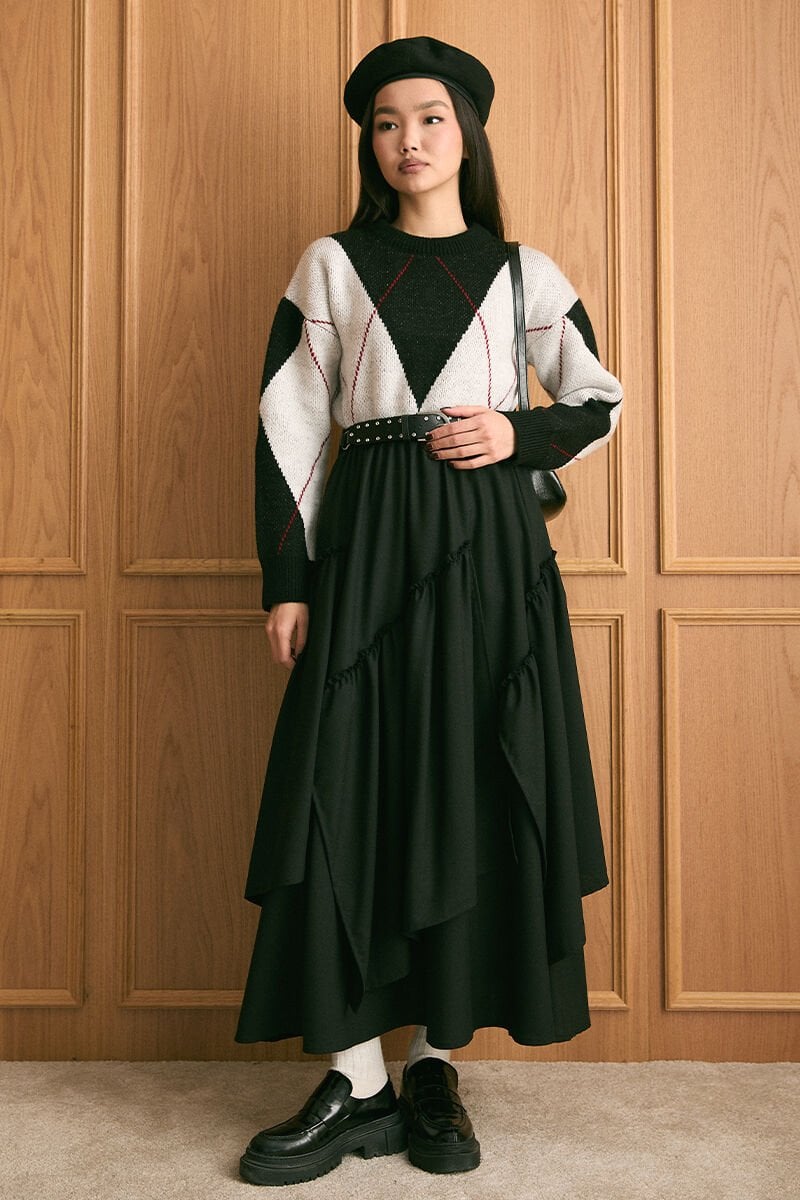 Siyah Baklava Desen Triko Kazak & Siyah Poliviskon Bohem Kat Etek Takım