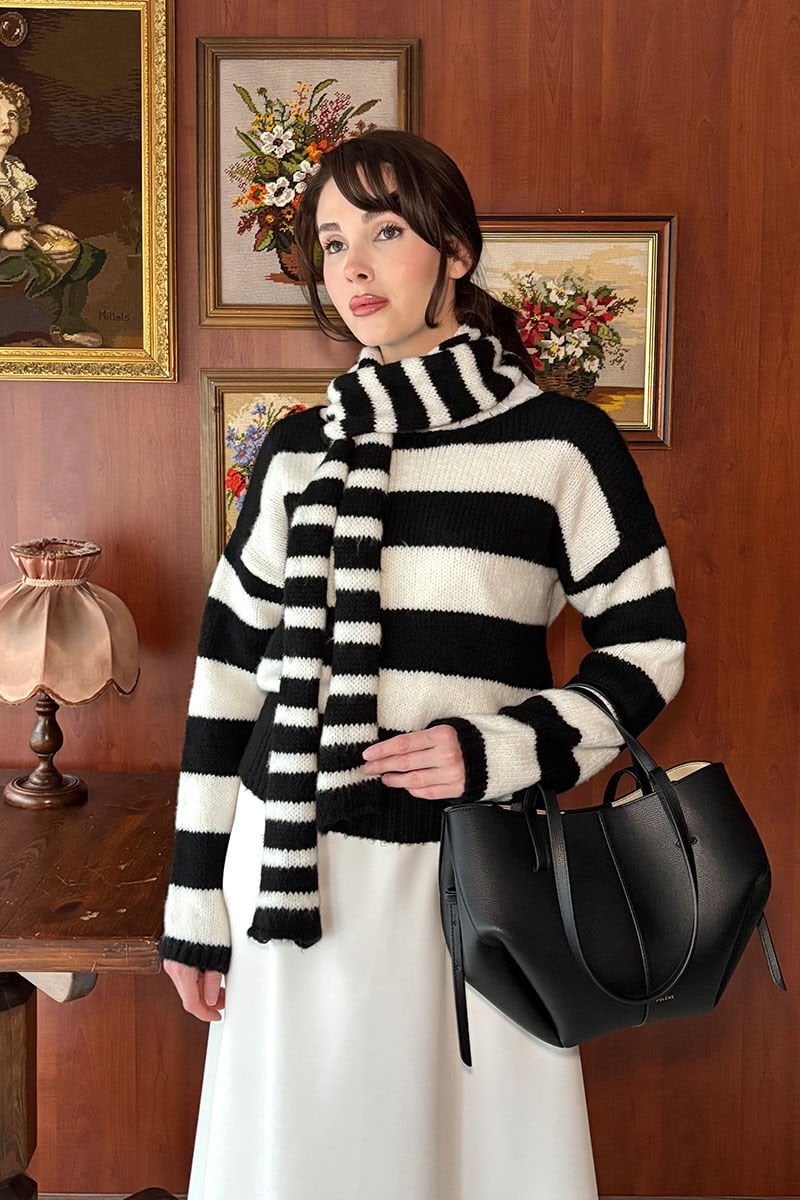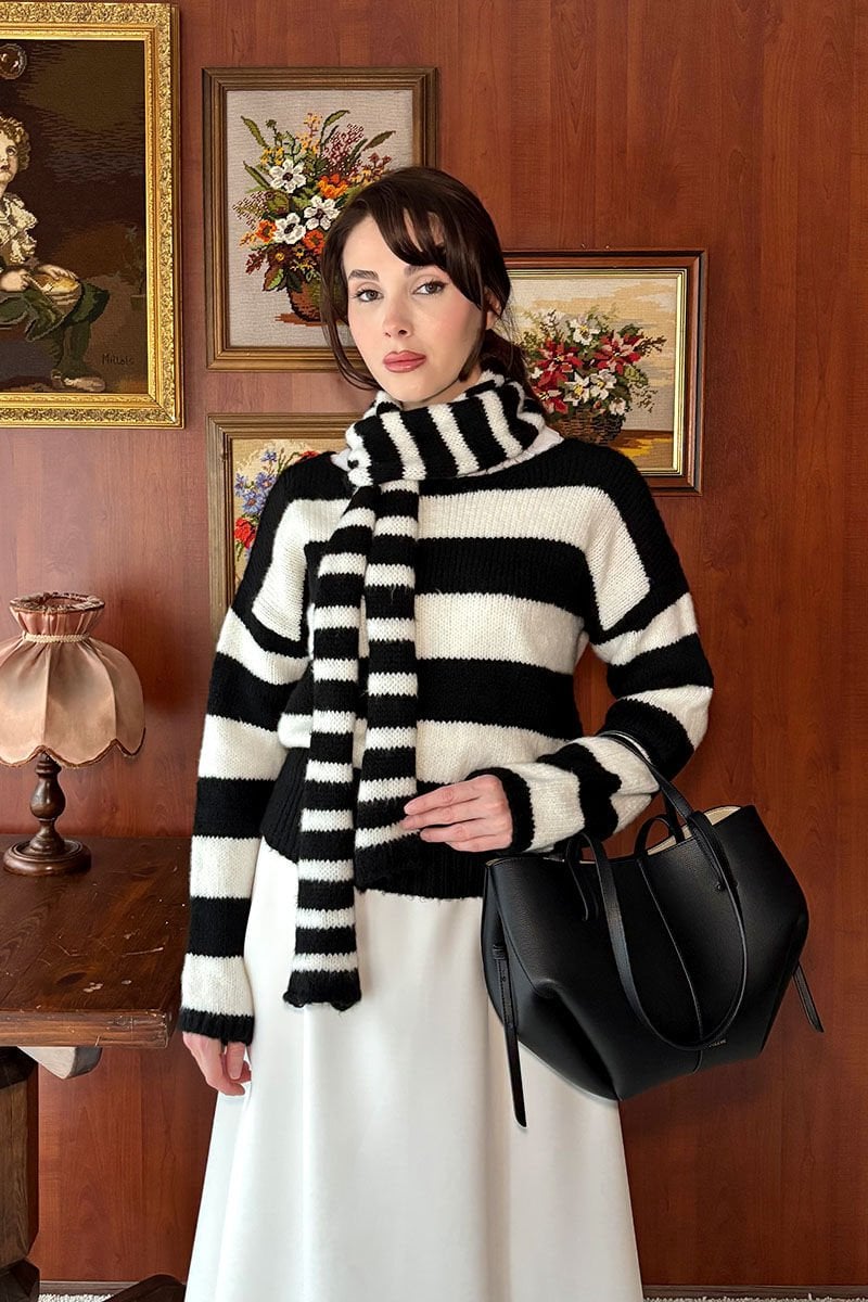 Siyah Beyaz Çizgili Atkı Detay Kazak