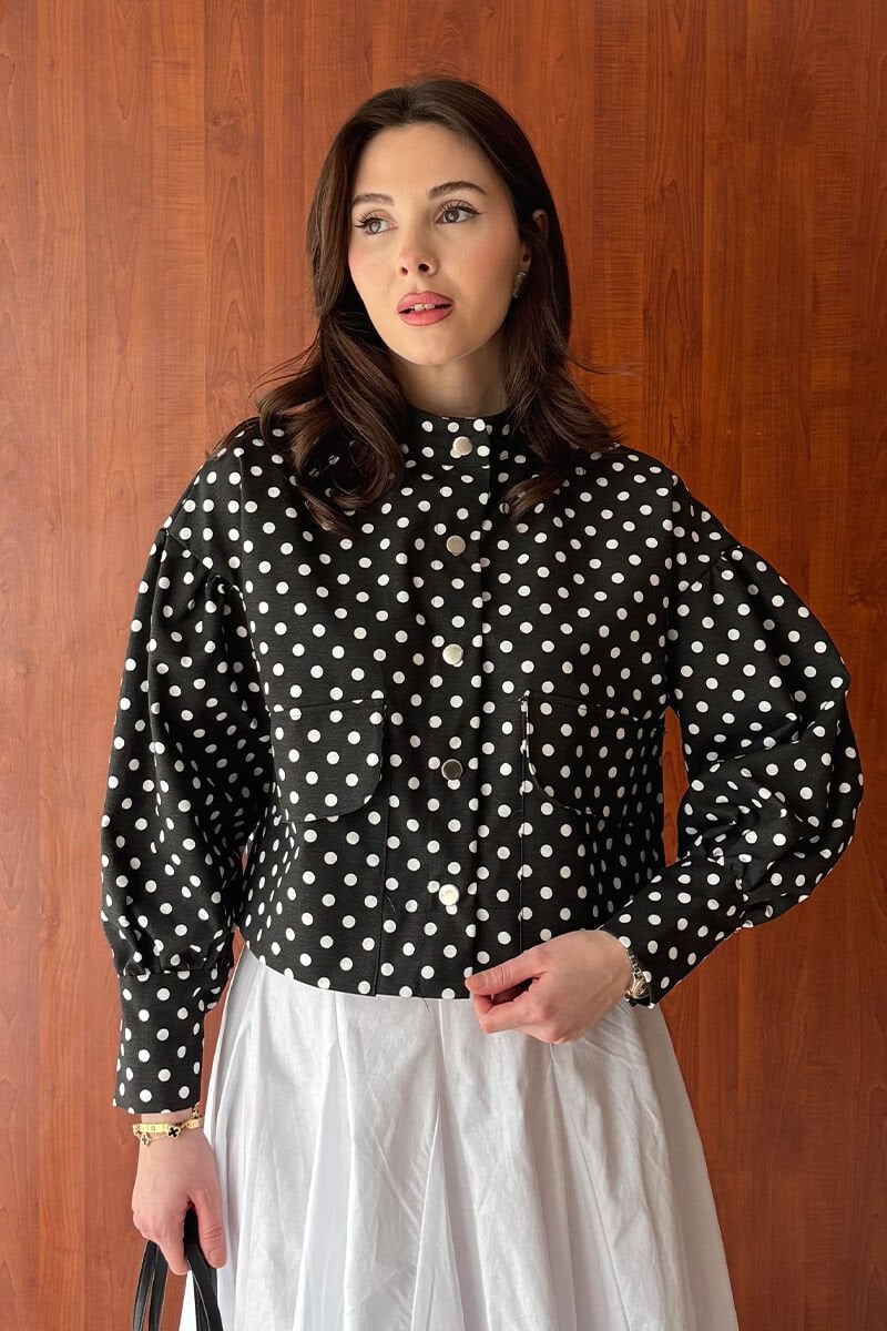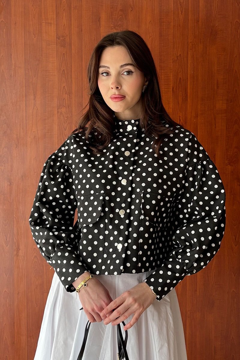 Şıklığı ve zarafeti bir arada sunan beyaz siyah puantiyeli ceket, gardırobunuzun vazgeçilmezi olacak.