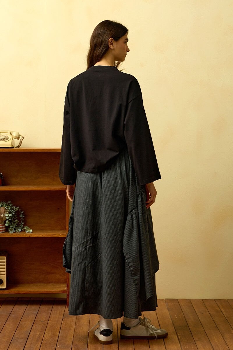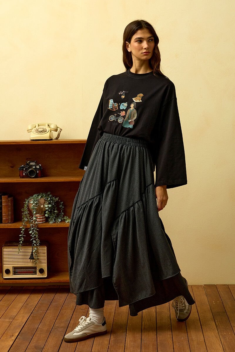 Siyah Bisiklet Baskılı Basic Body & Antrasit Çizgili Poliviskon Bohem Etek Kat Takım