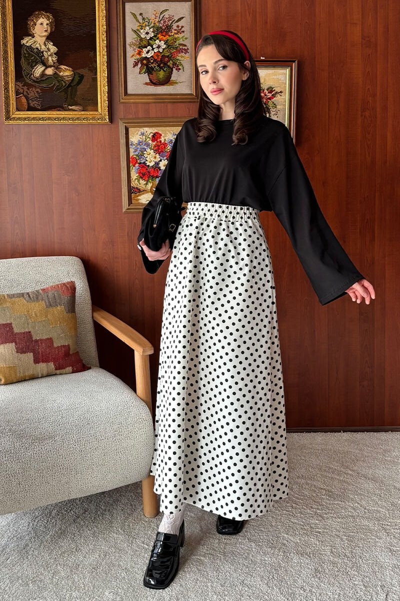 Siyah Body & Beyaz Siyah Puantiyeli Keten Kloş Etek Takım