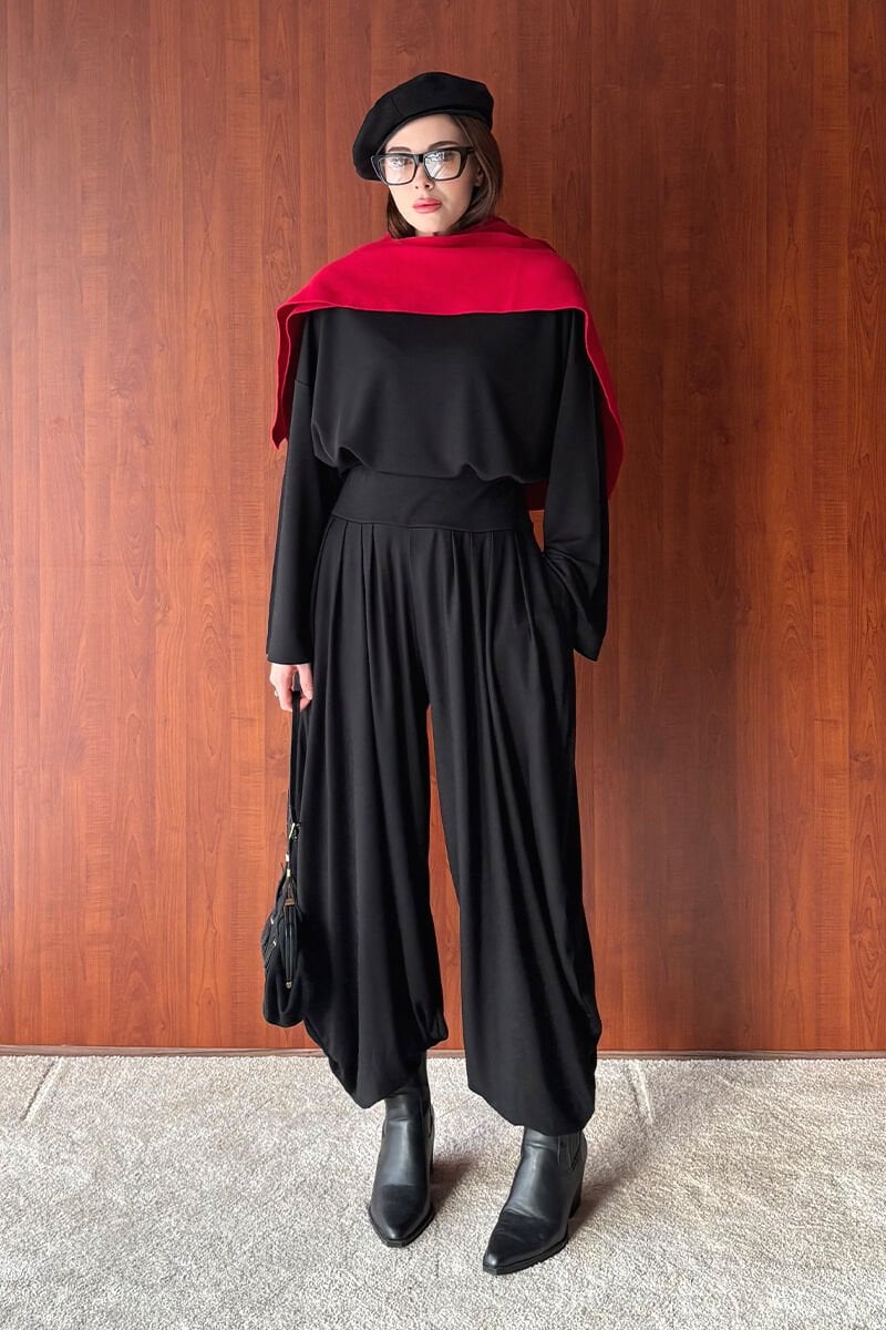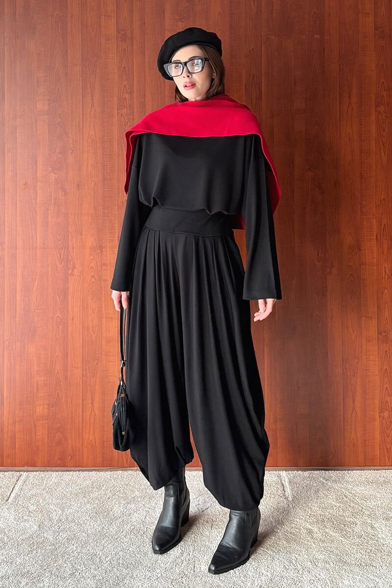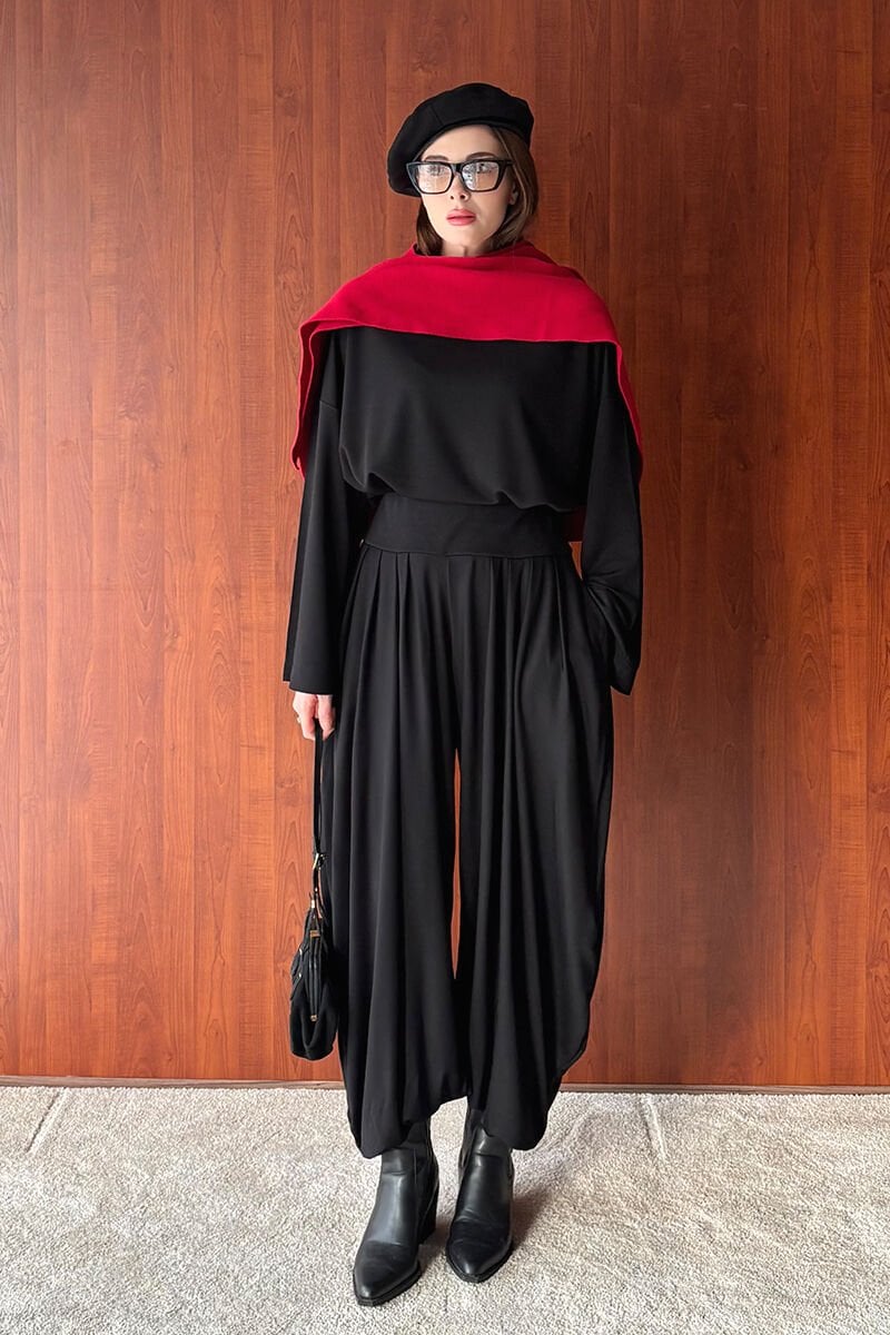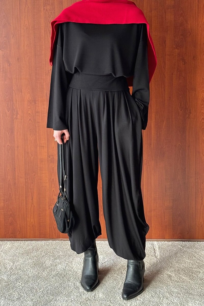Siyah Oysho Kumaş Pileli Şalvar Takım