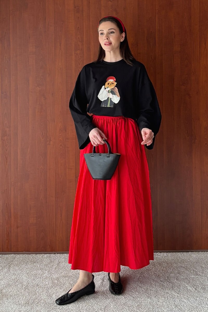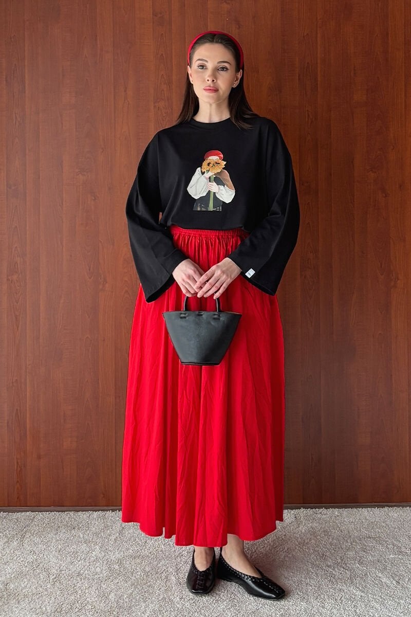 Siyah Çiçekli Kız Baskılı Basic Body & Kırmızı Kraşlı Balon Etek Takım