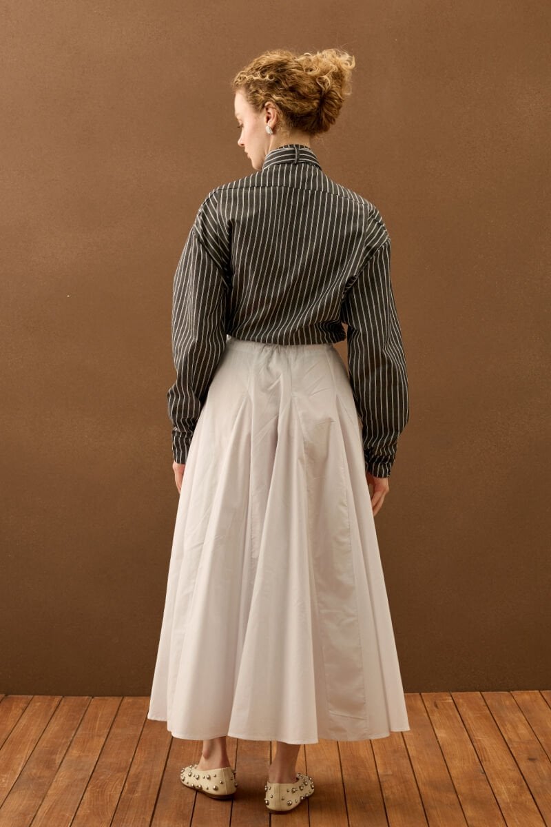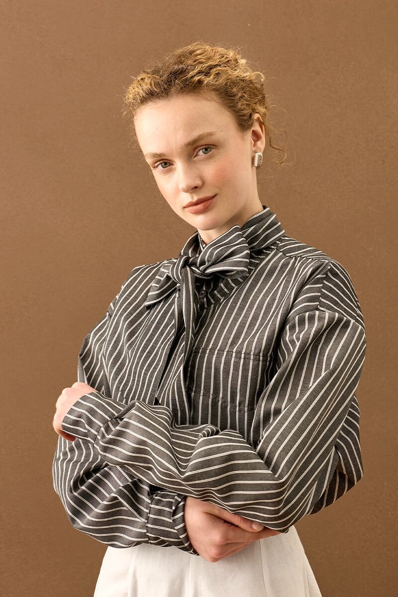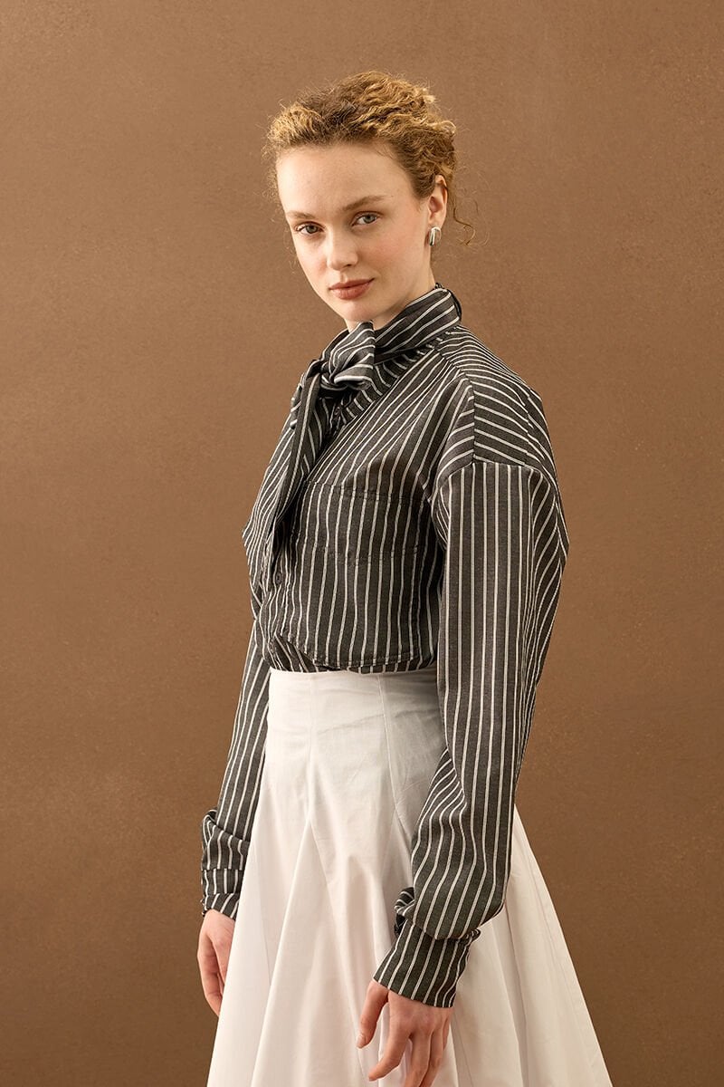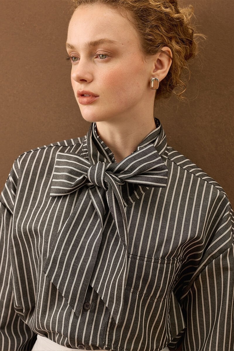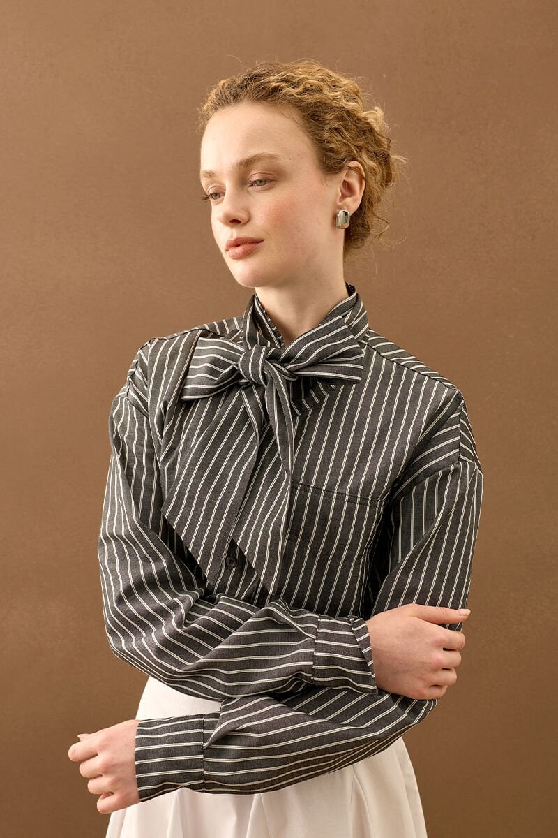 Çizgili yakası fiyonklu gömlek, zarif detaylarıyla stilinize şıklık katıyor.