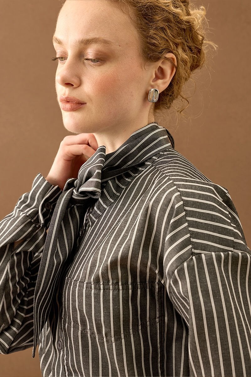 Siyah Çizgili Fularlı Gömlek