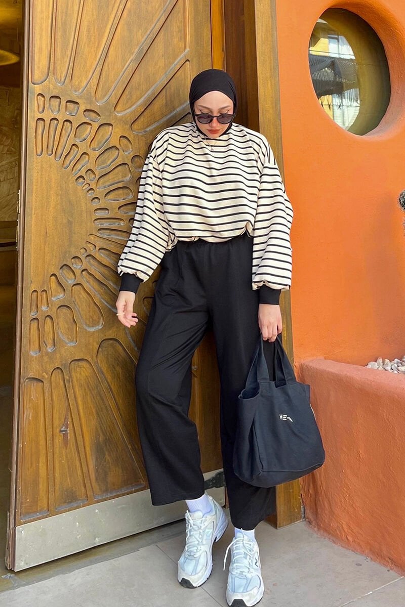Siyah Çizgili Sweat & Şalvar Pantolon Takım