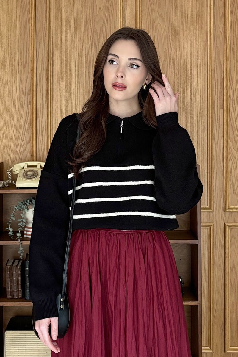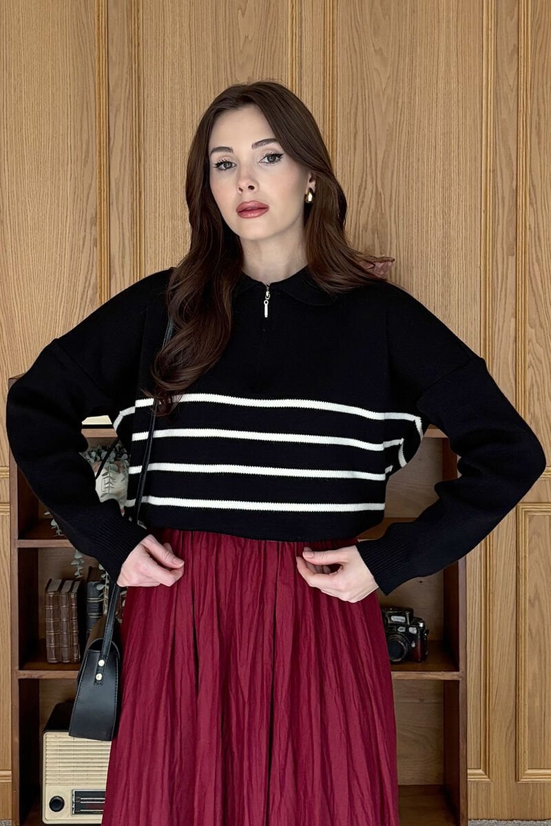 Bu çizgili triko kazak, şıklığı ve rahatlığı bir arada sunuyor.