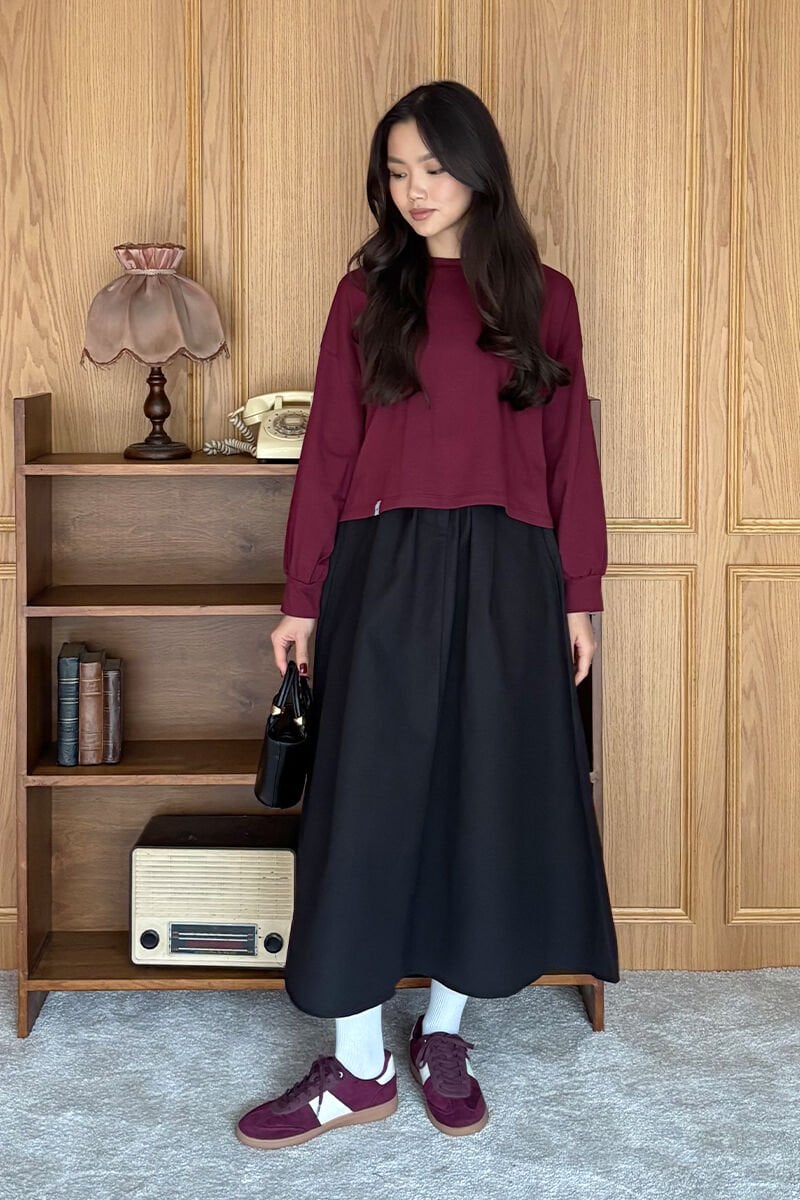 Bordo Crop & Siyah Keten Tek Düğmeli Etek Takım