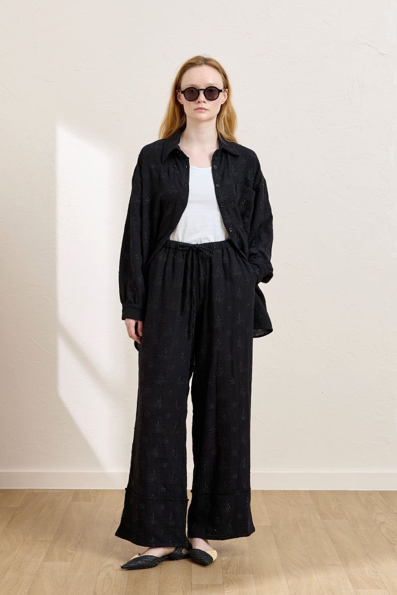 Siyah Fistolu Müslin Double Paça Pantolon