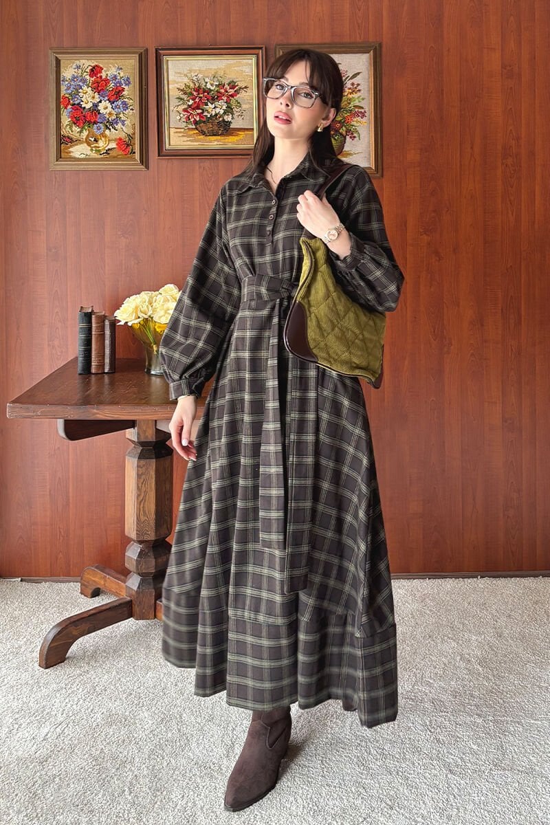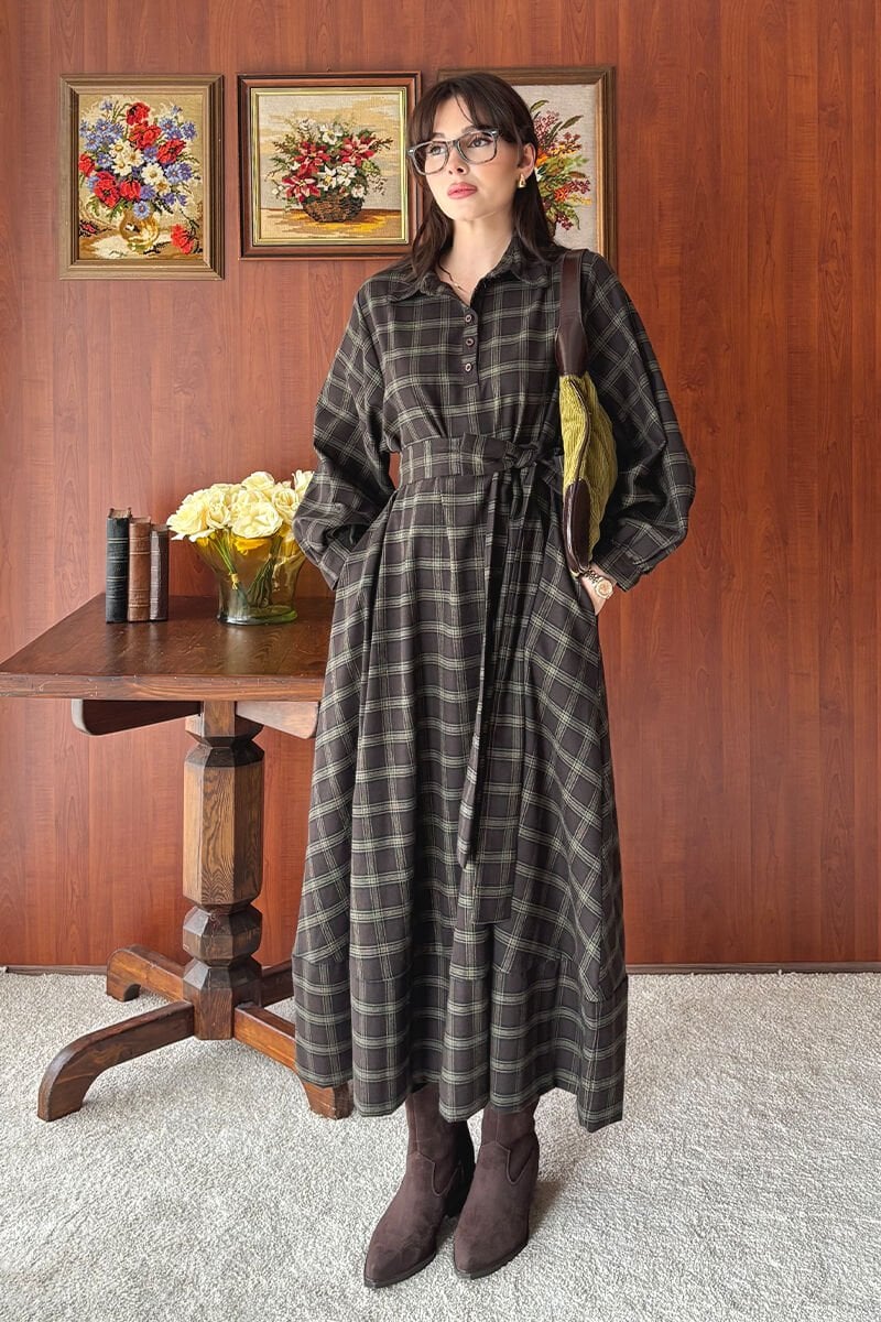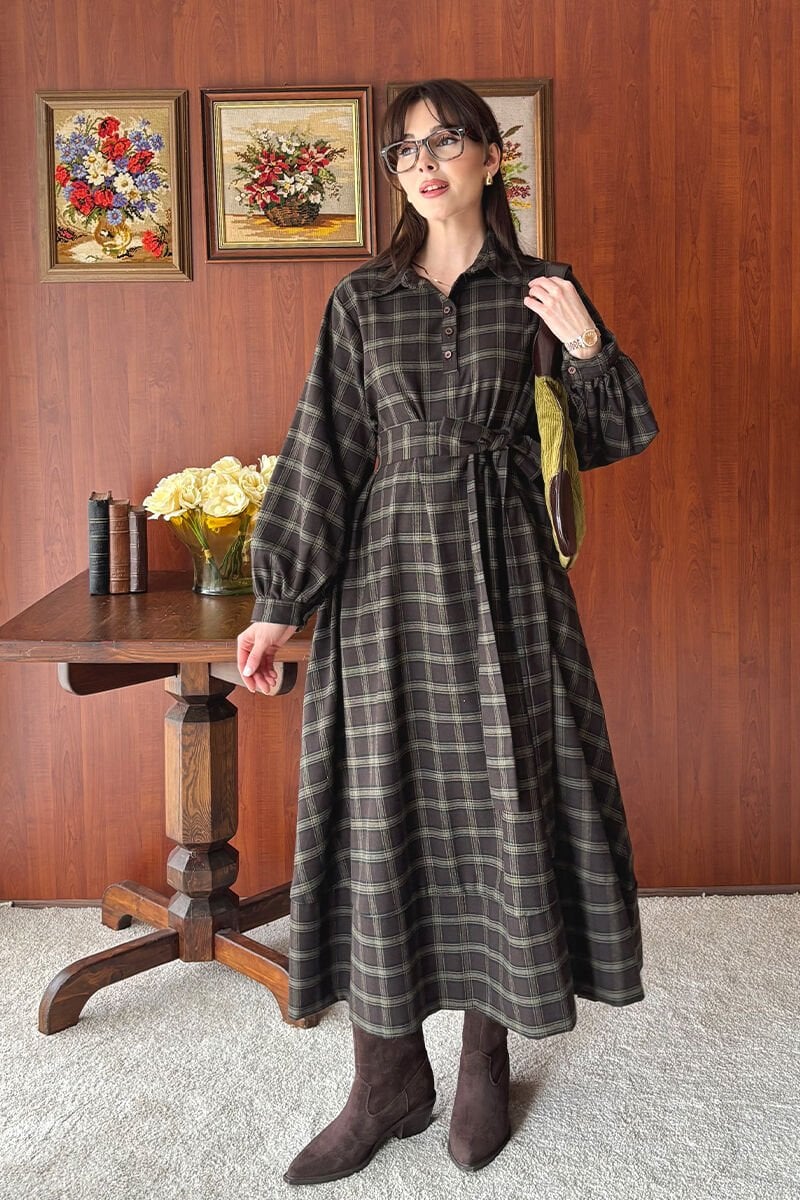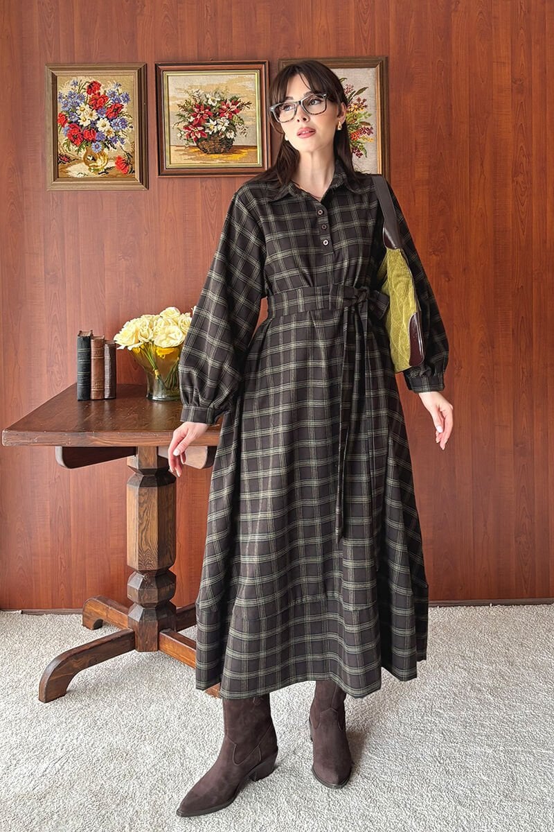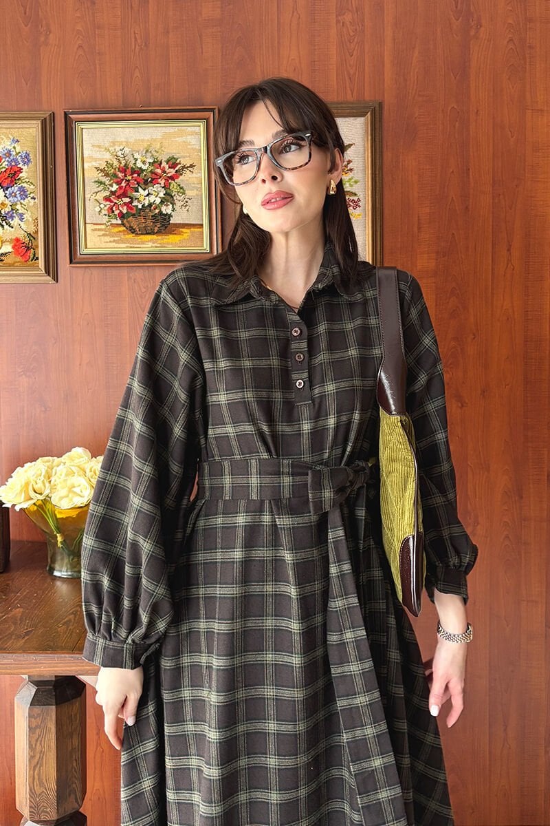 Acı Kahve Ekoseli Vintage Elbise