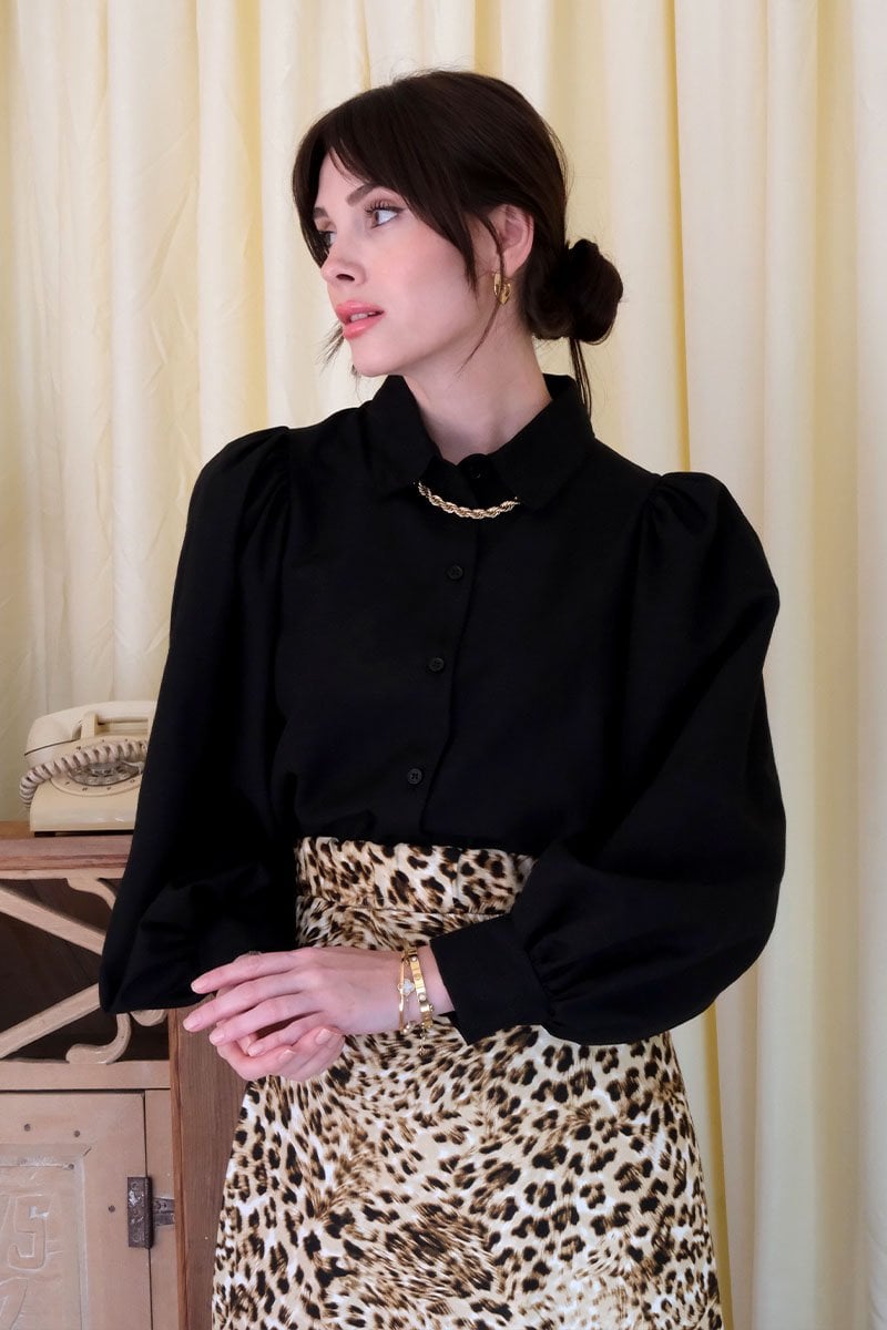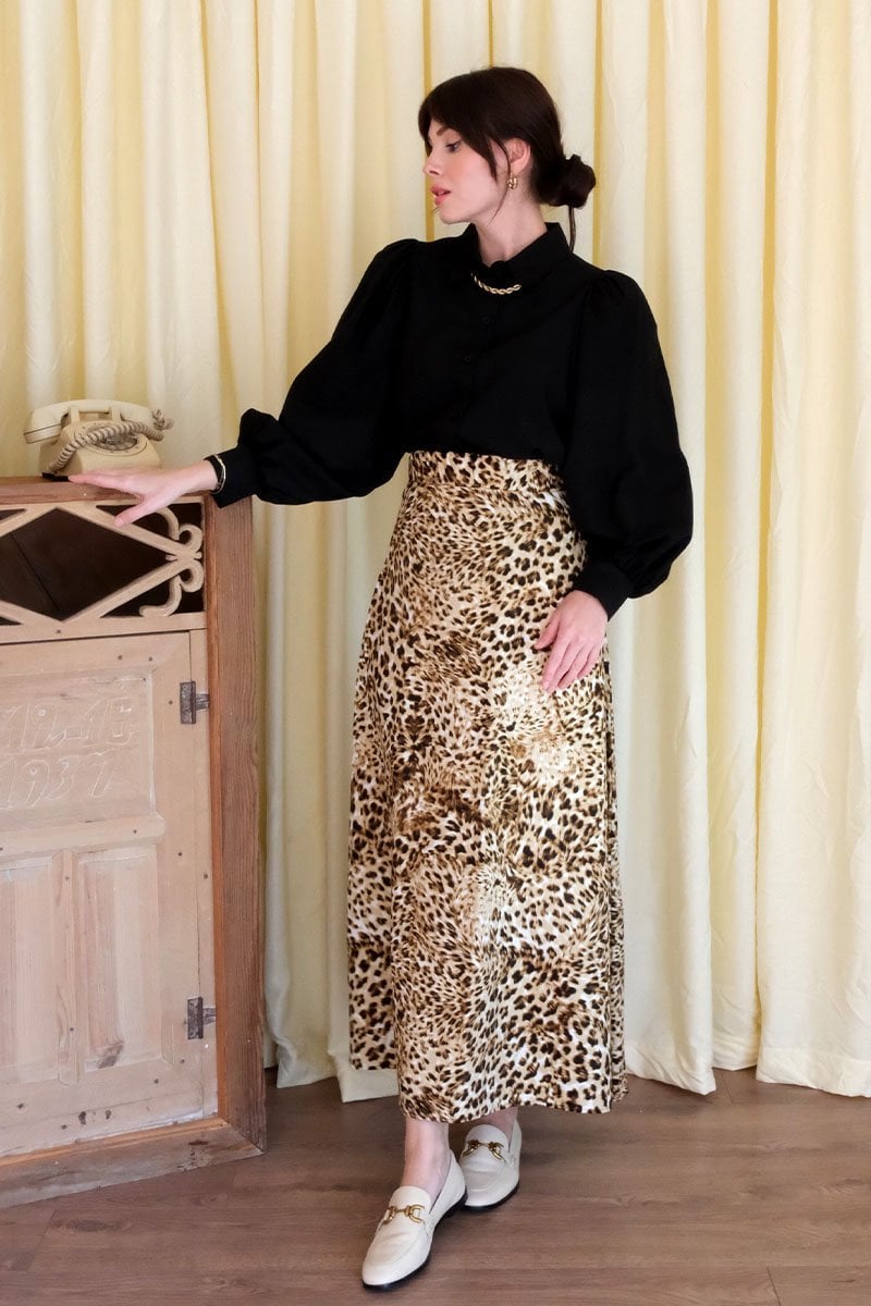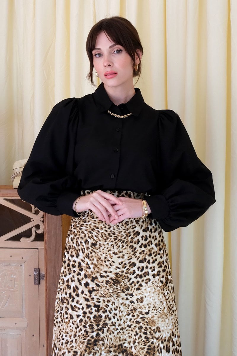 Siyah Klasik Yaka Crop Gömlek & Leopar Desen Pamuk Saten Kloş Etek