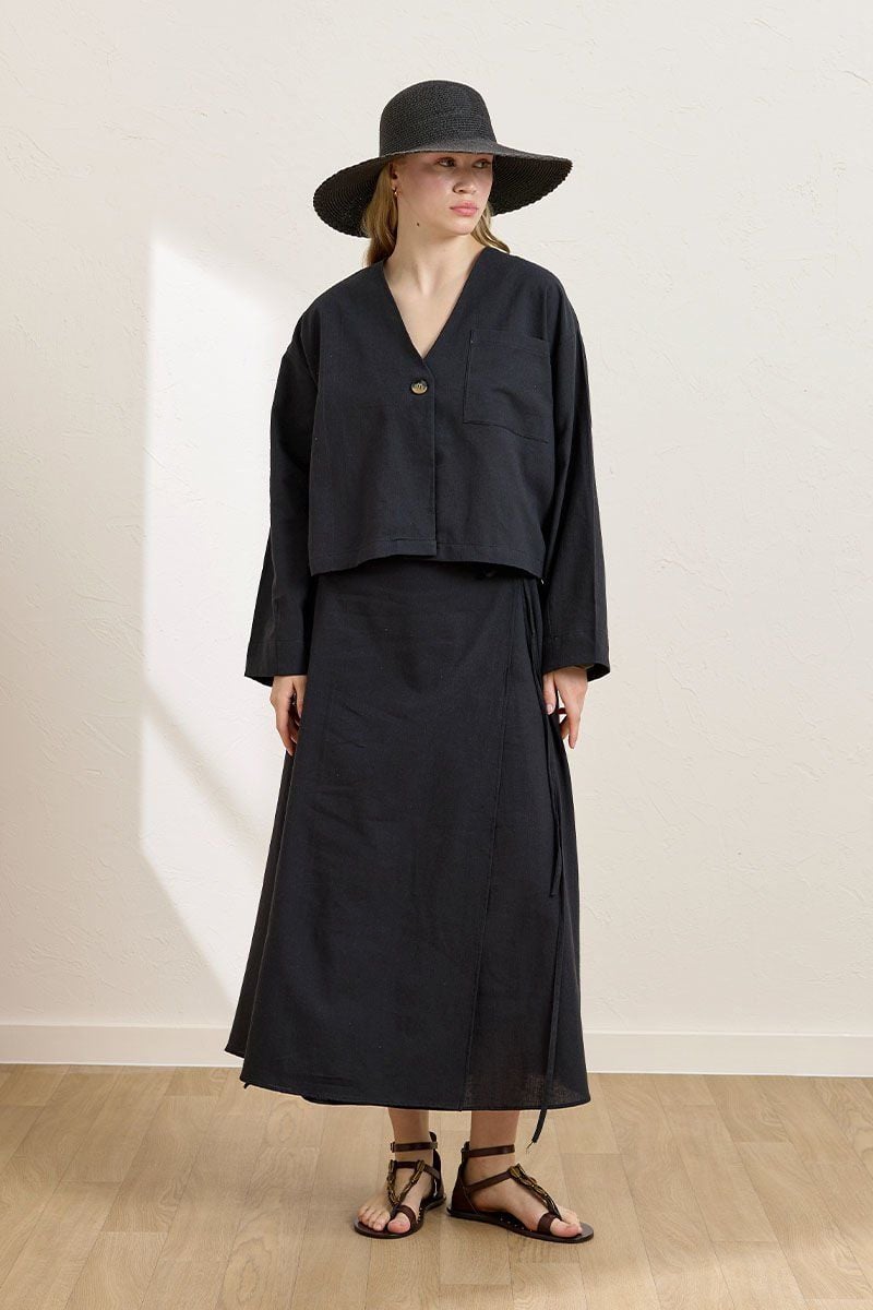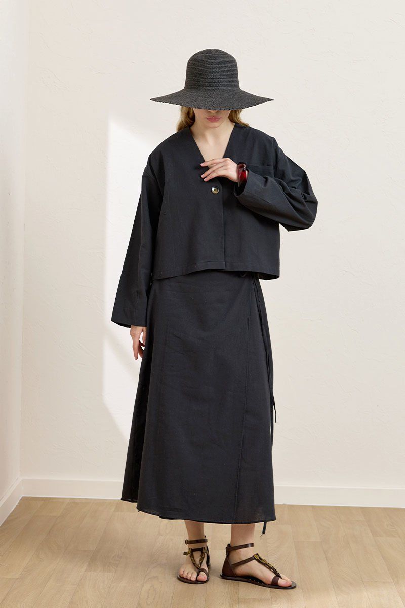 Bu organik keten ceket ve etek takımı, sade ve zarif bir görünüm sunar.