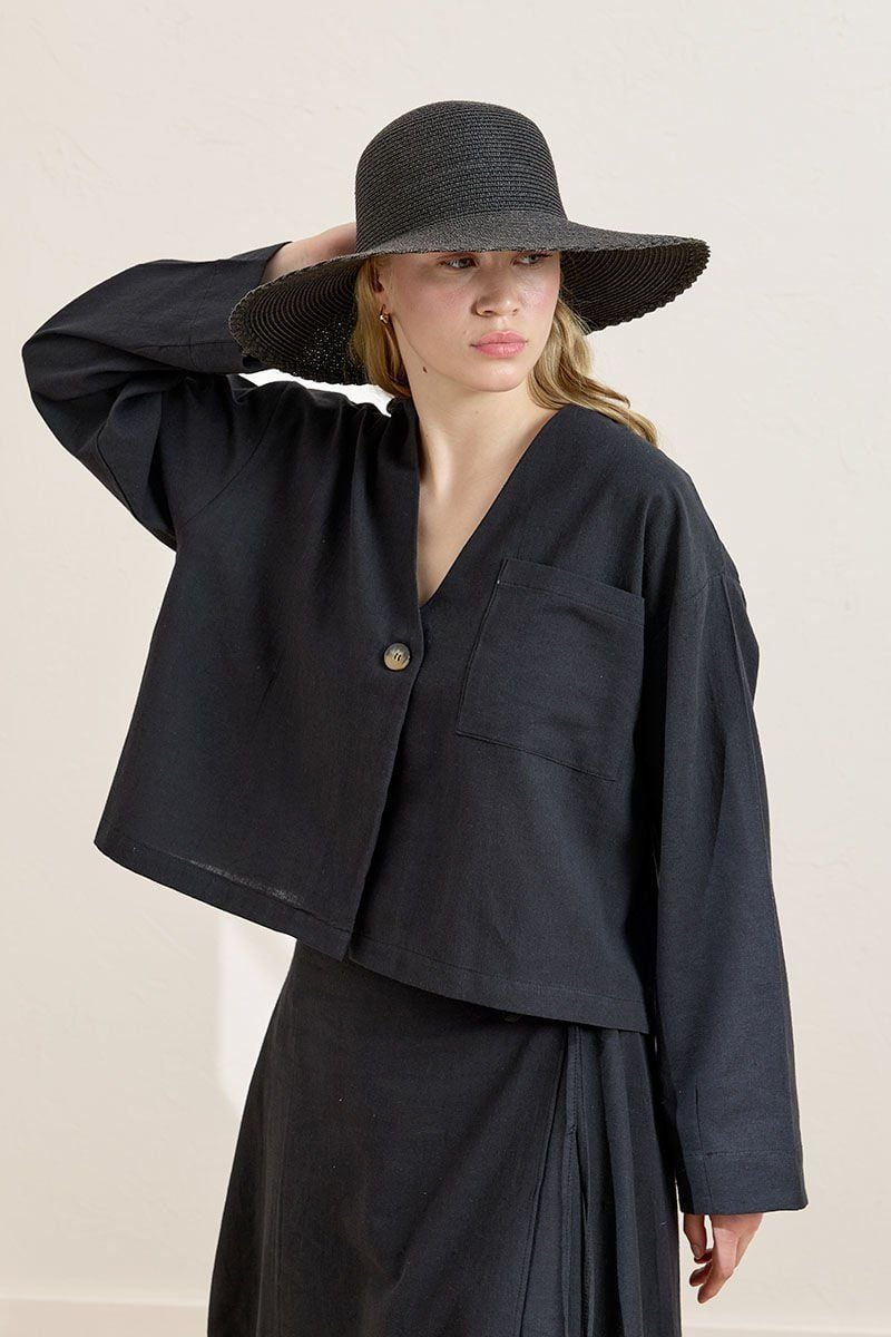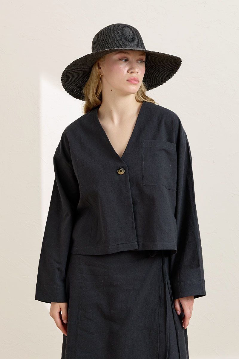 Doğal malzeme kullanımıyla rahat bir giyim deneyimi sunarken, tek cepli ceket detayıyla şıklığı ön plana çıkarıyor.