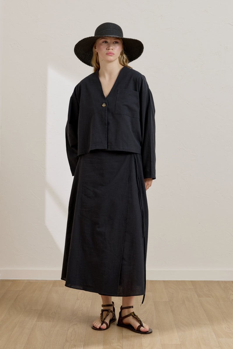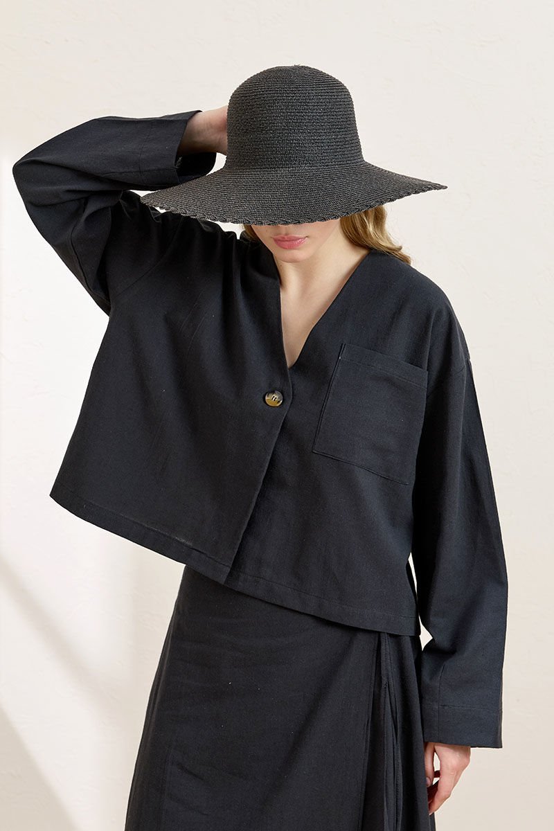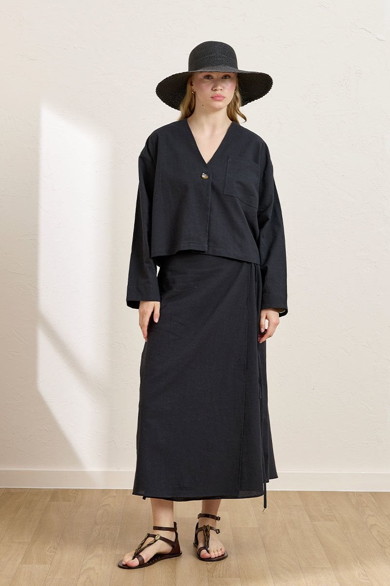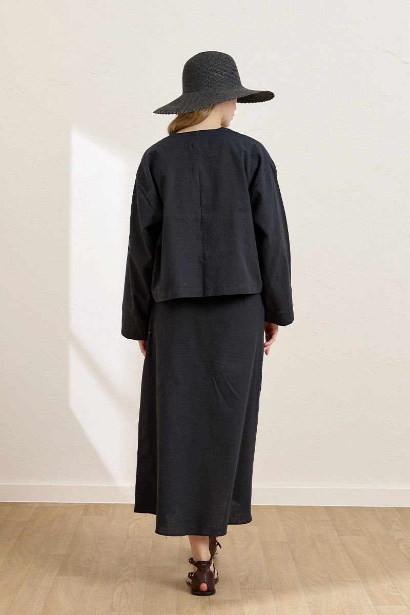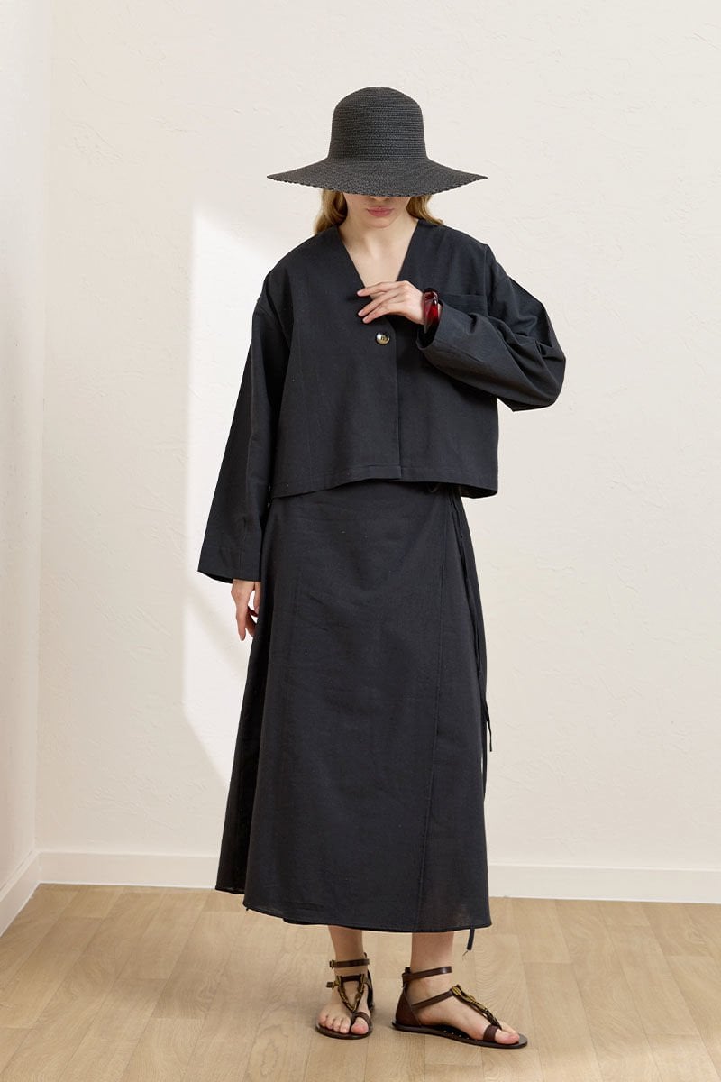 Siyah Organik Keten Tek Cepli Ceket & Anvelop Etek Takım