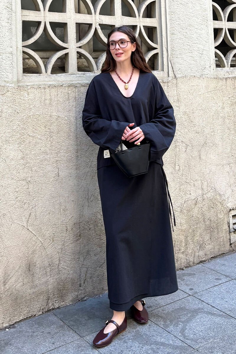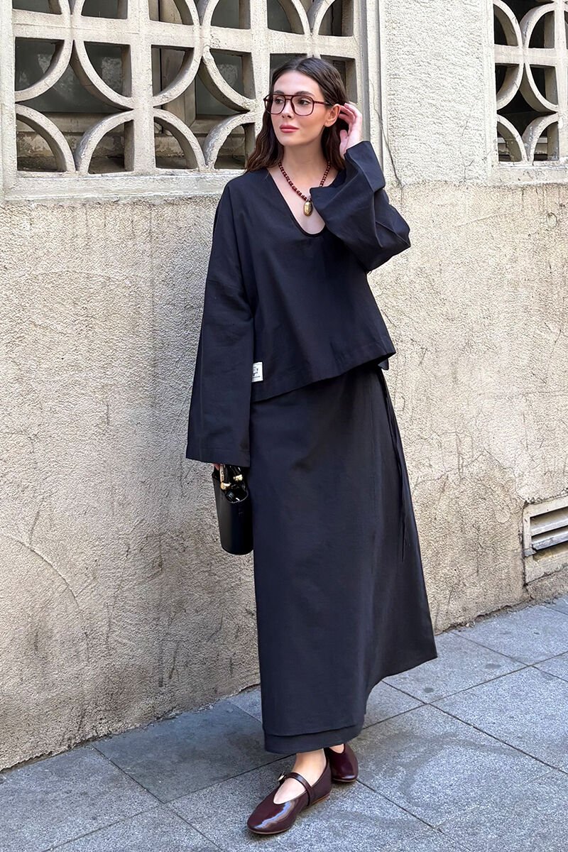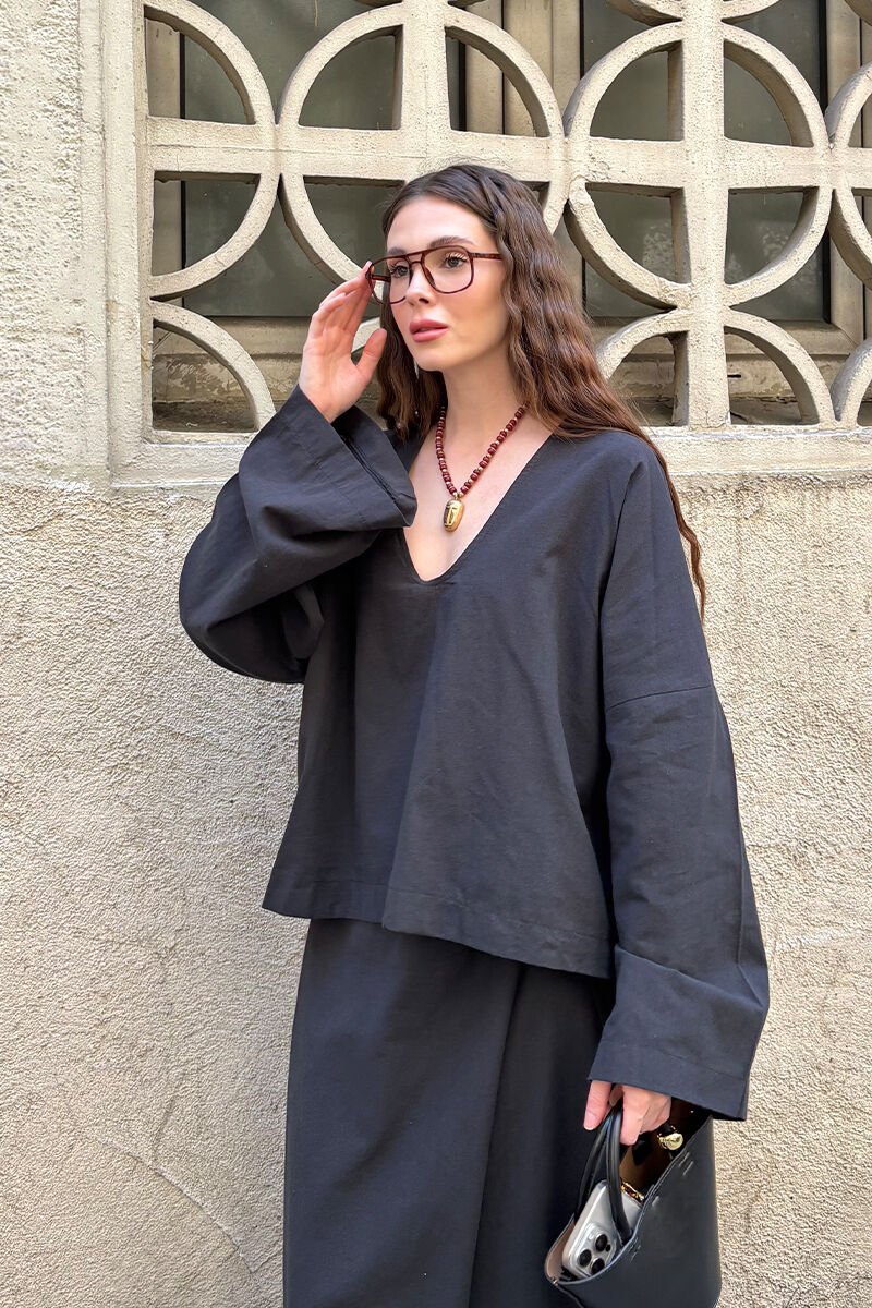 Siyah Organik Keten V Yaka Bluz