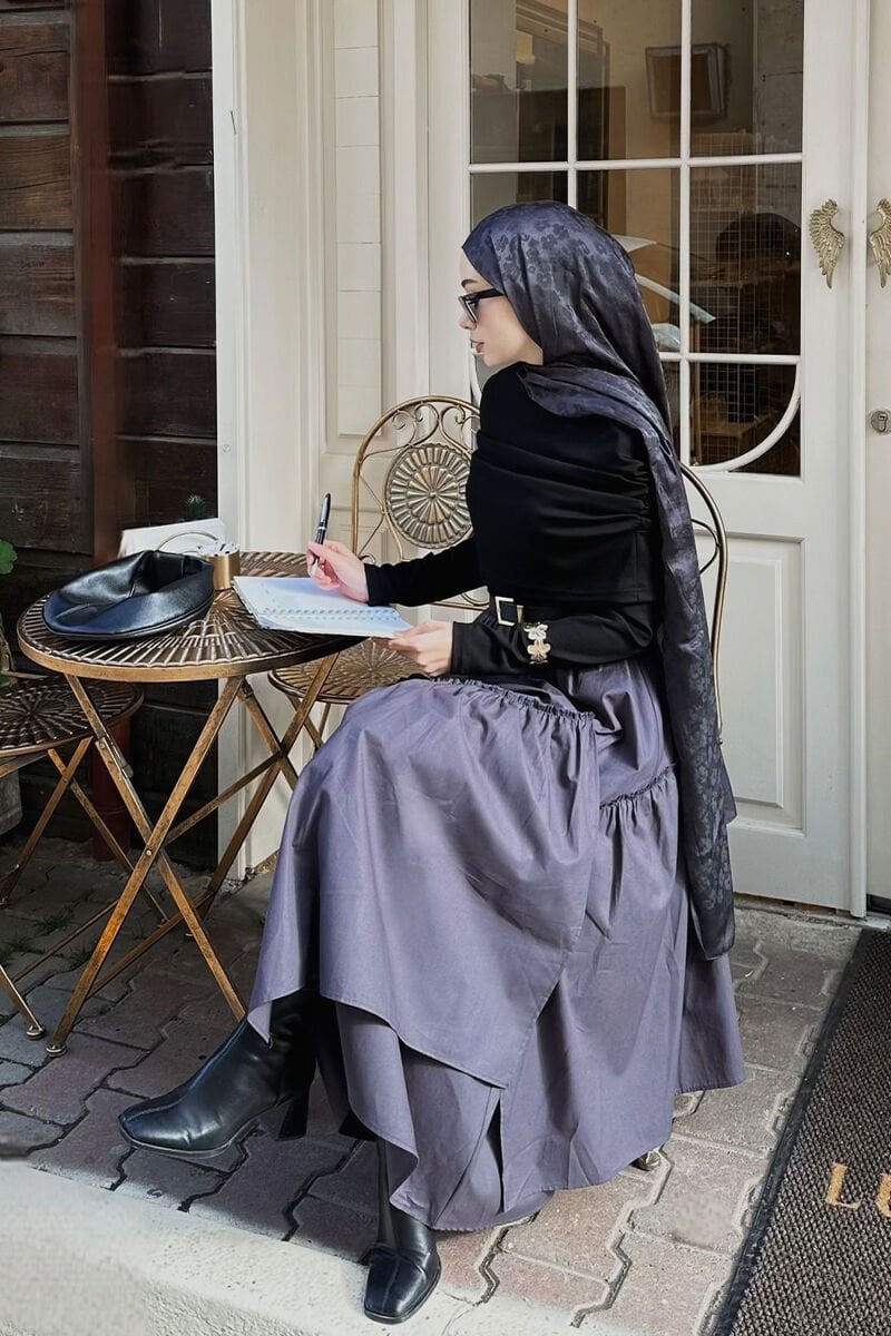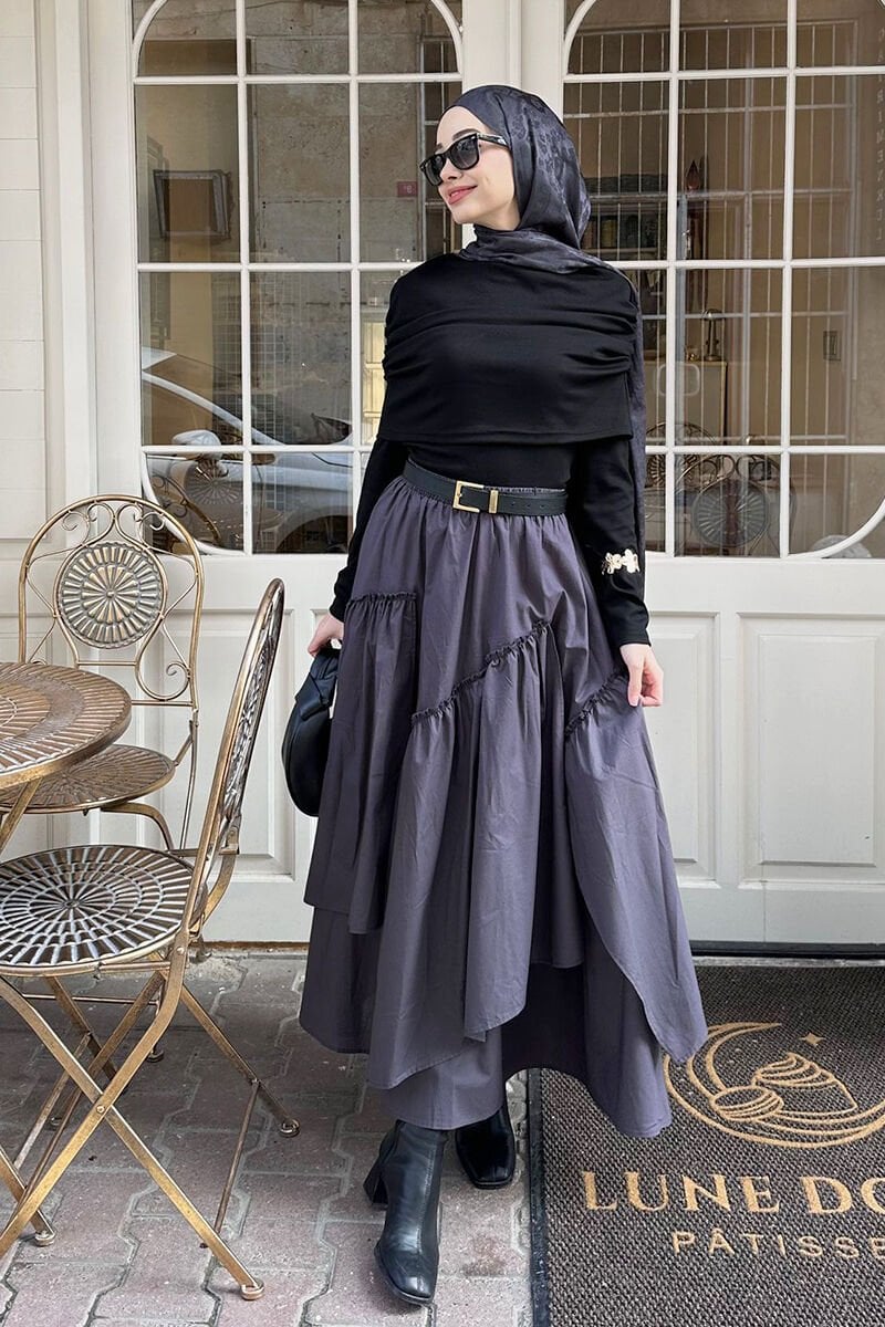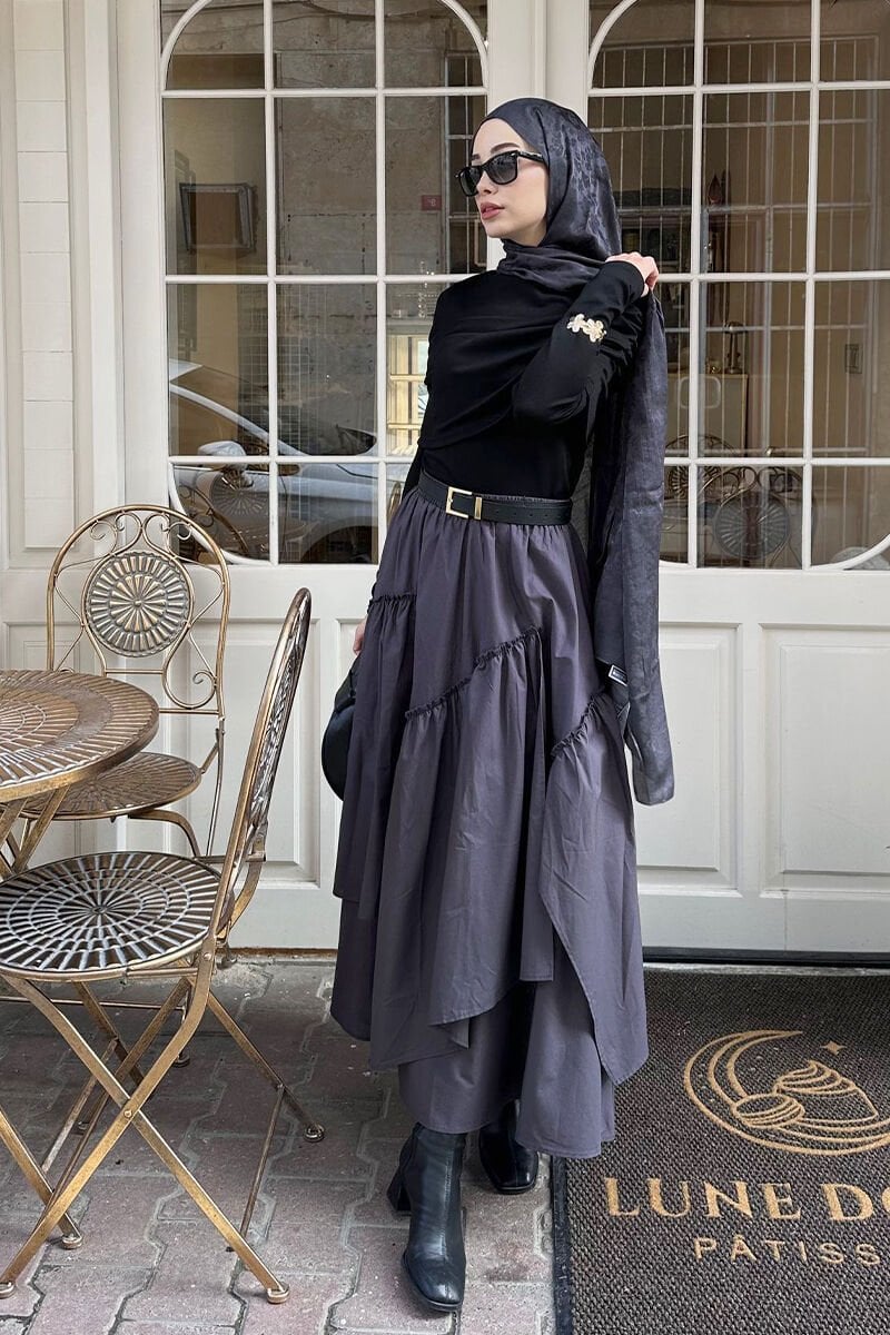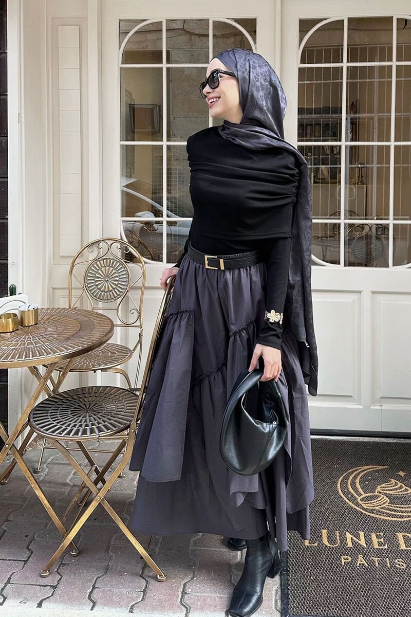 Siyah Oysho Büzgü Detaylı Bluz & Antrasit Koton Bohem Kat Etek Takım