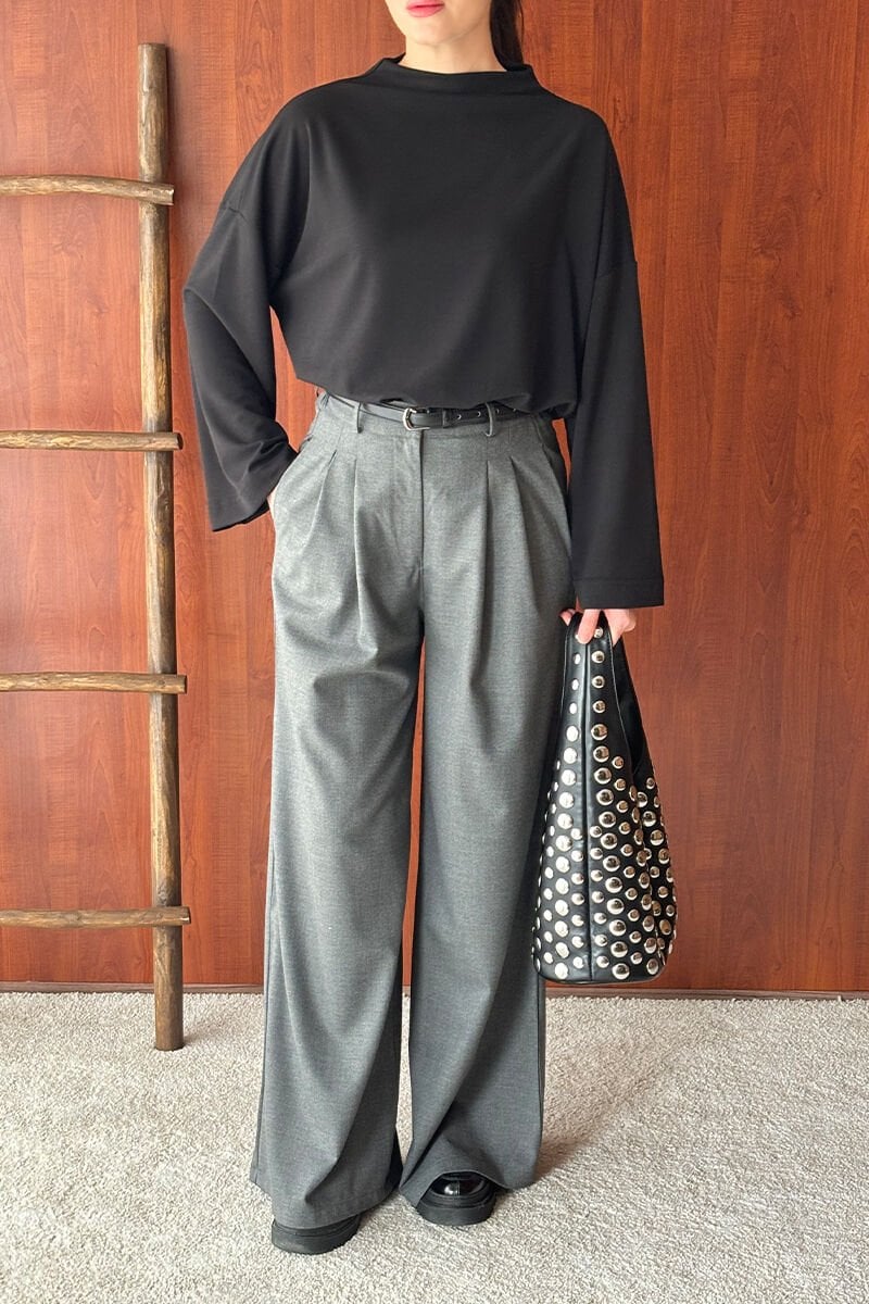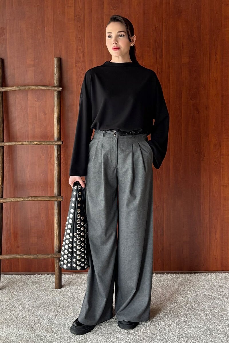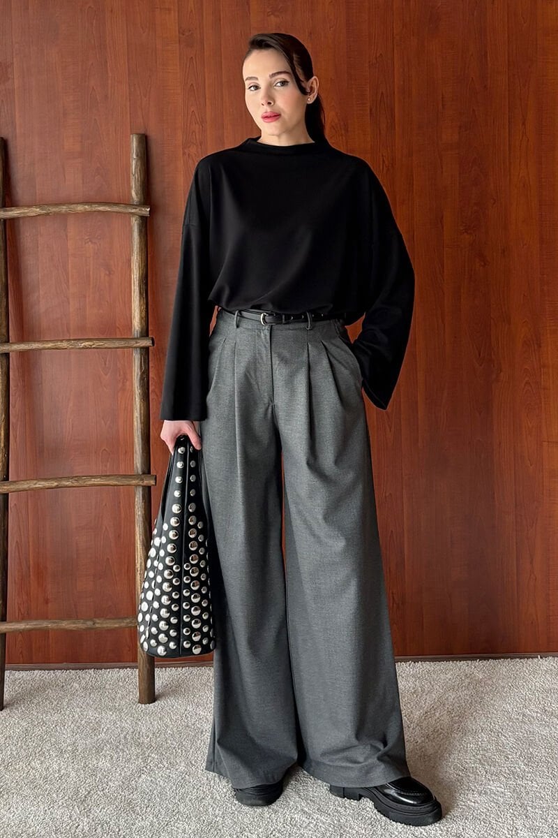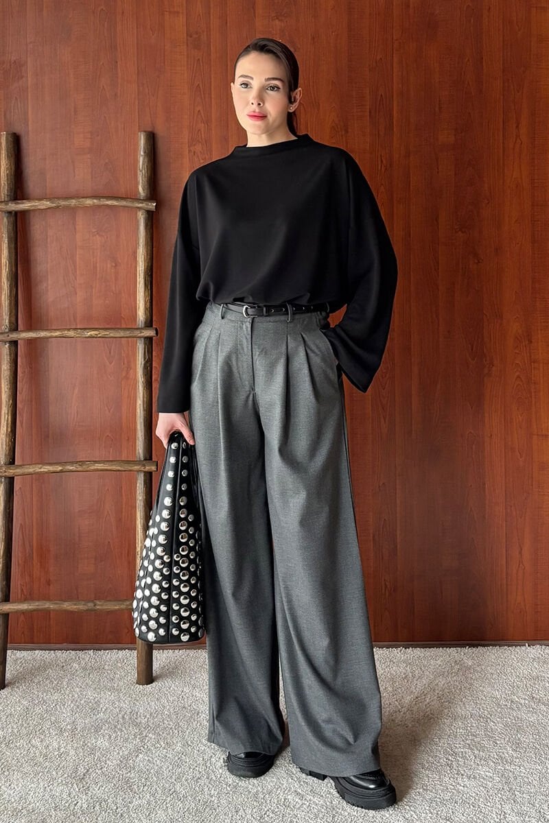 Siyah Oysho Dik Yaka Bluz & Antrasit Pile Detay Palazzo Pantolon
