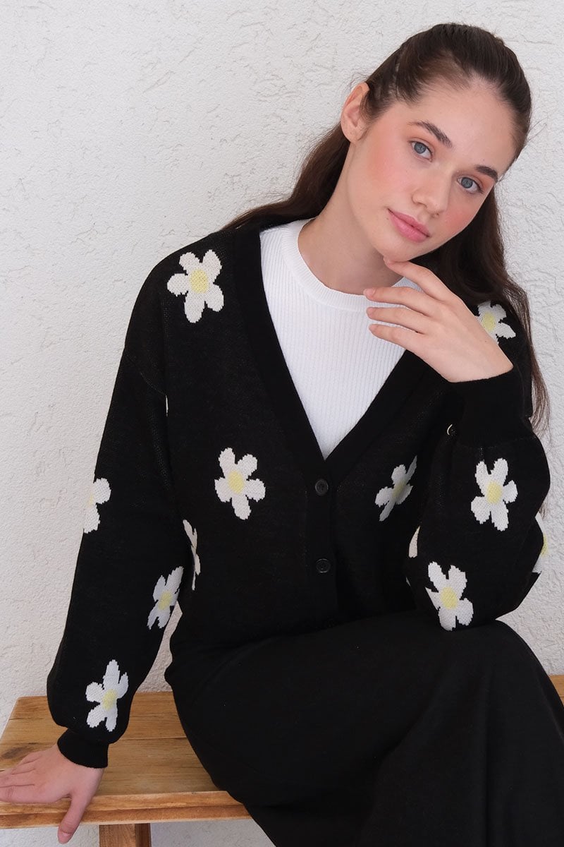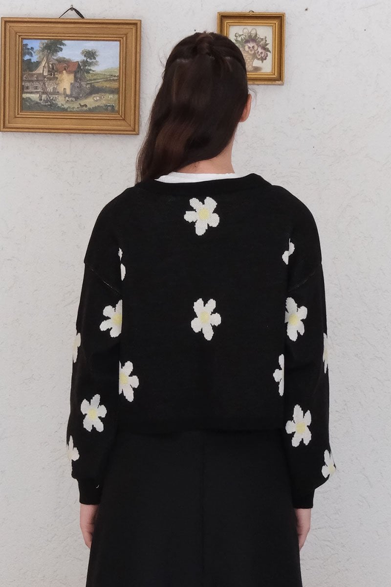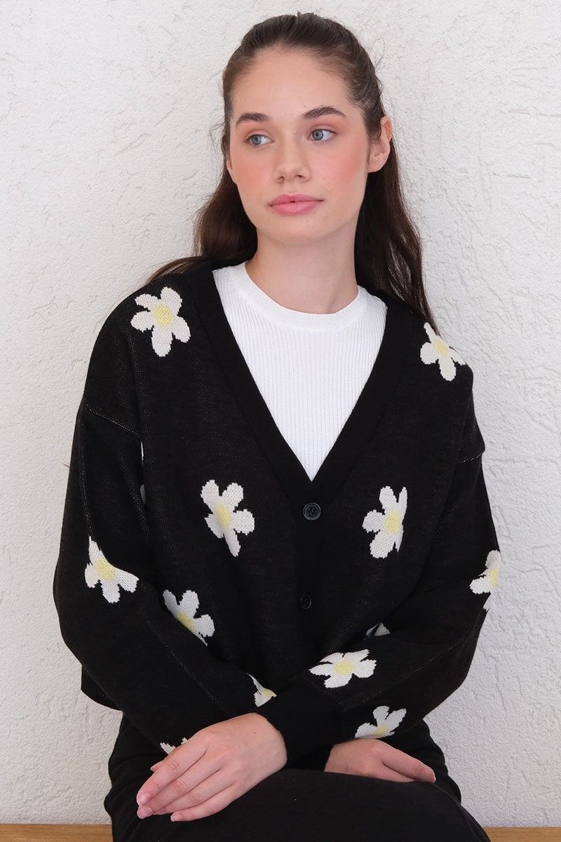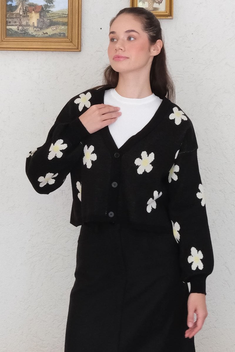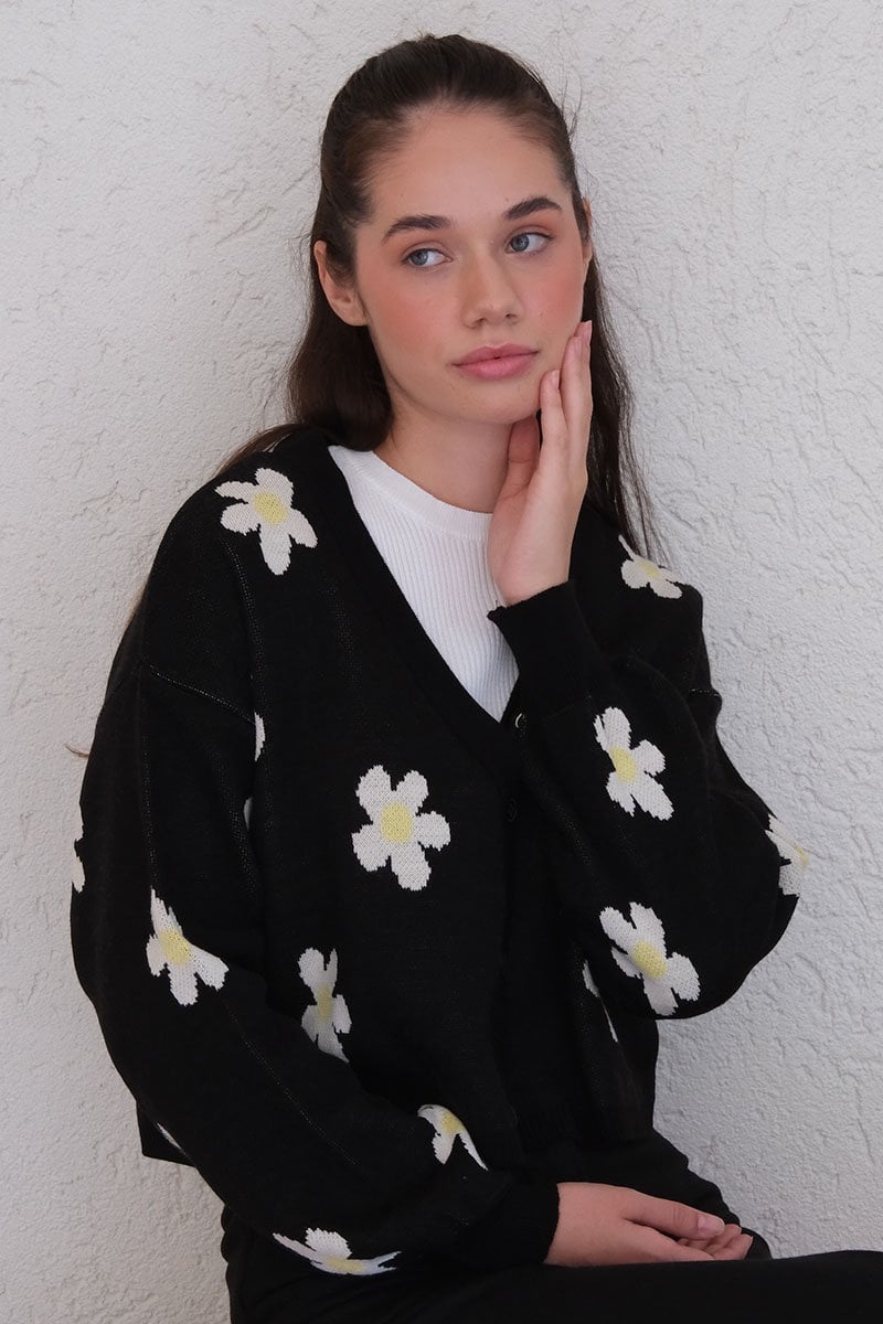 Siyah Papatya Desen Triko Crop Hırka