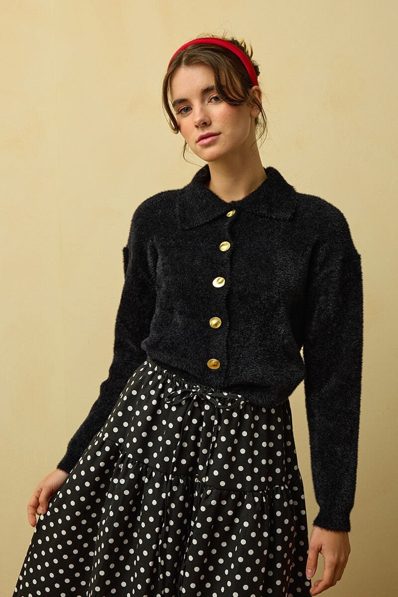 Siyah Polo Yaka Peluş Hırka