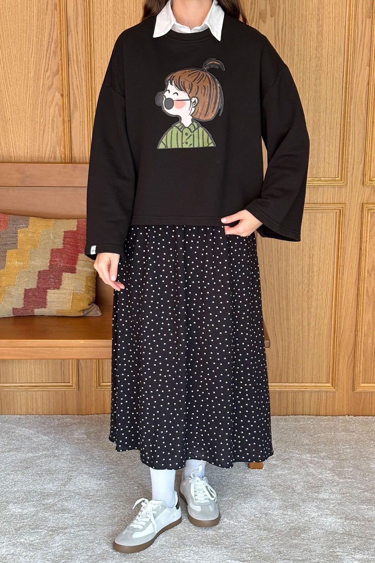Bu puantiye detaylı etek, her tarza ve her duruma uygun şık ve modern bir parçadır.