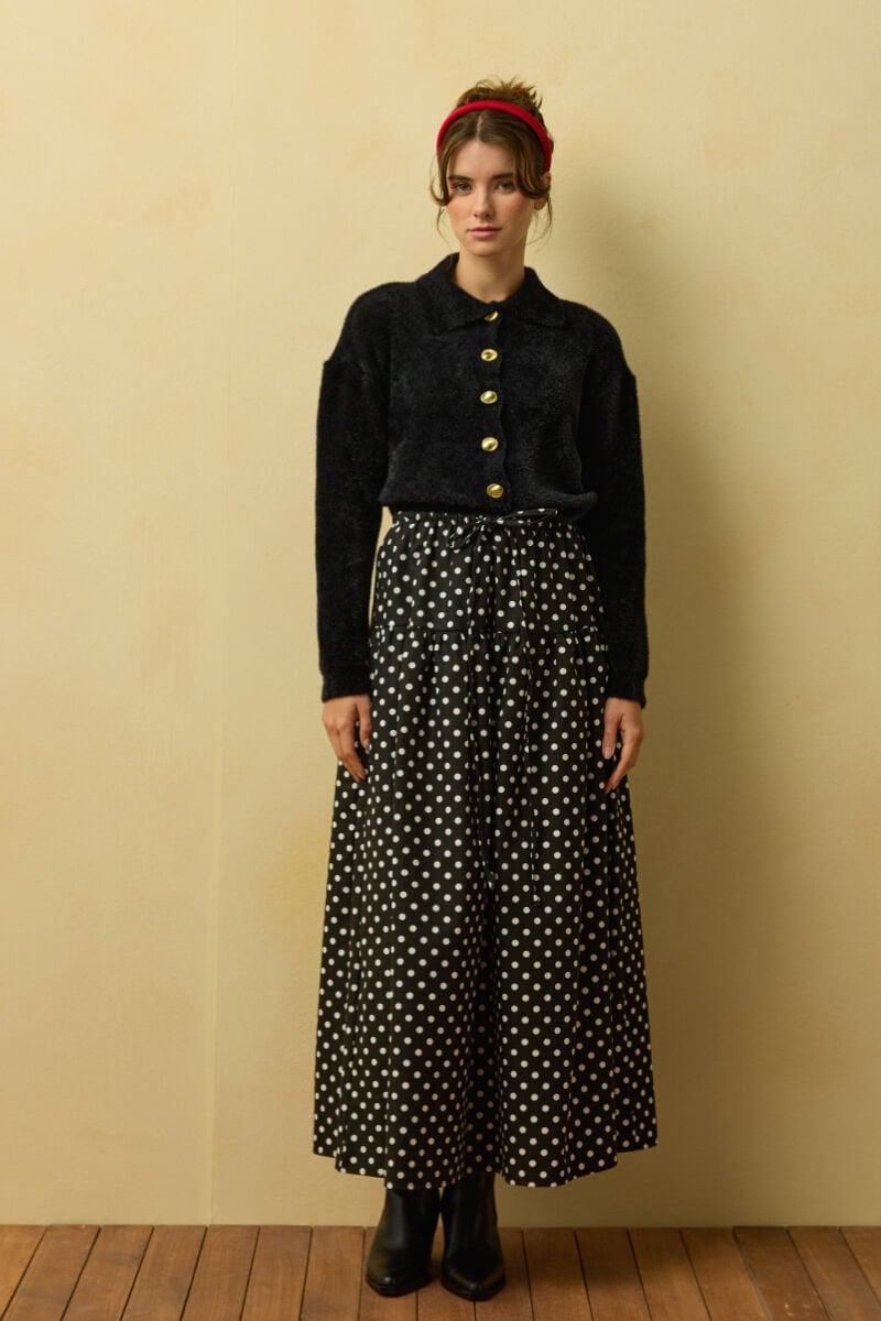 Siyah Puantiyeli Fırfır Detay Keten Etek