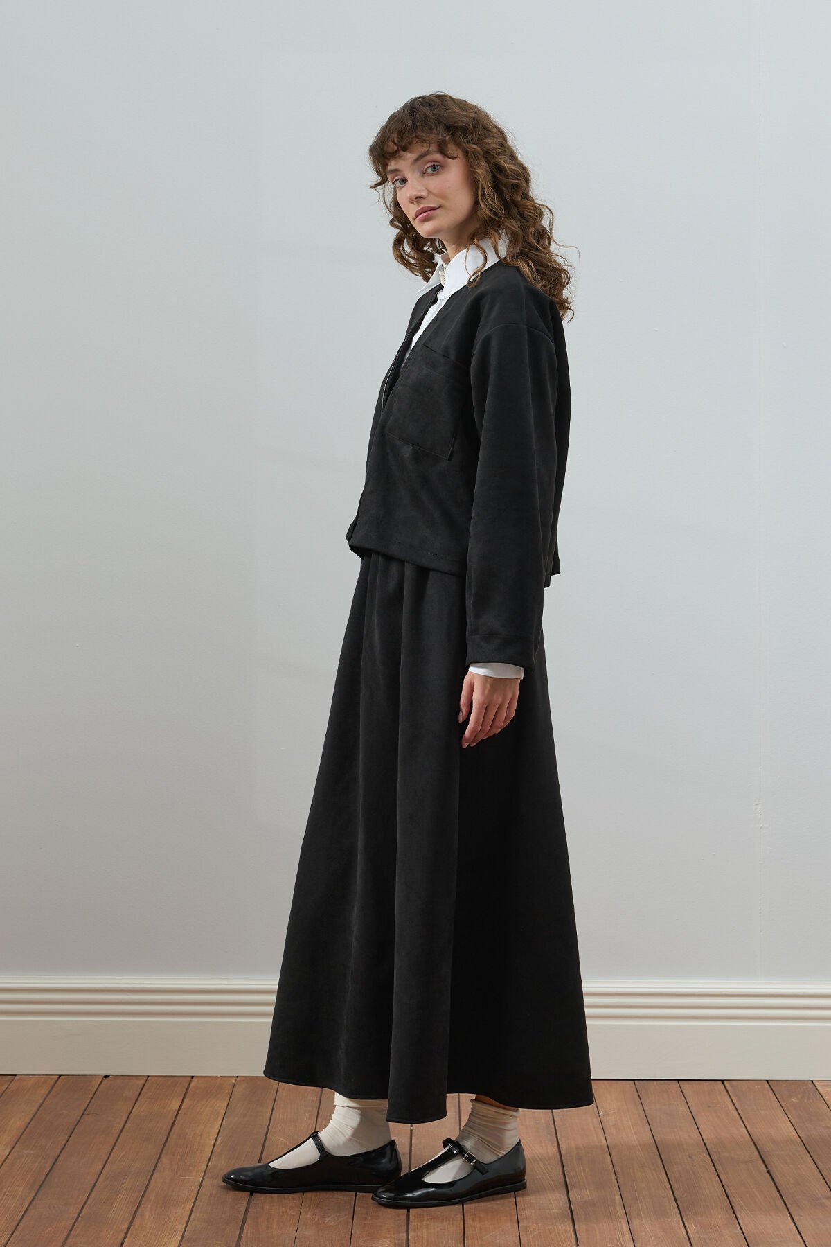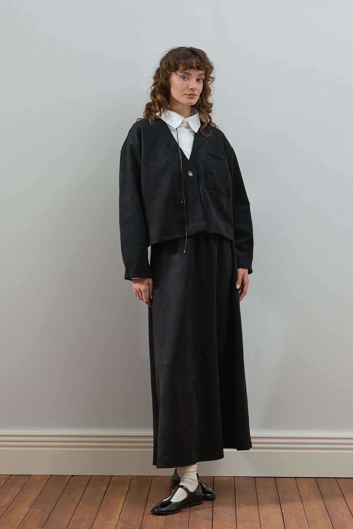 Bu süet kloş etek, zarif ve şık görünümüyle dikkat çekiyor.