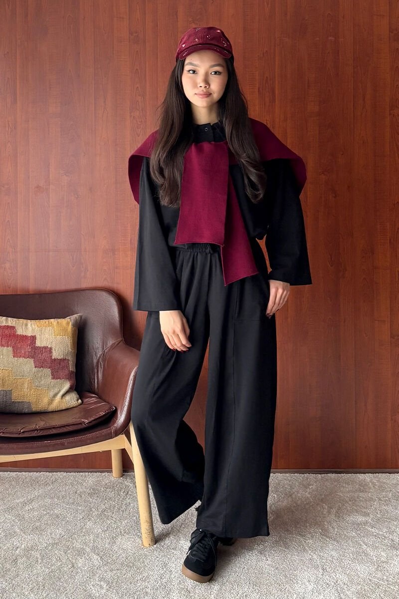 Polo yaka şalvar pantolon takım, rahatlığı ve şıklığı bir arada sunuyor.