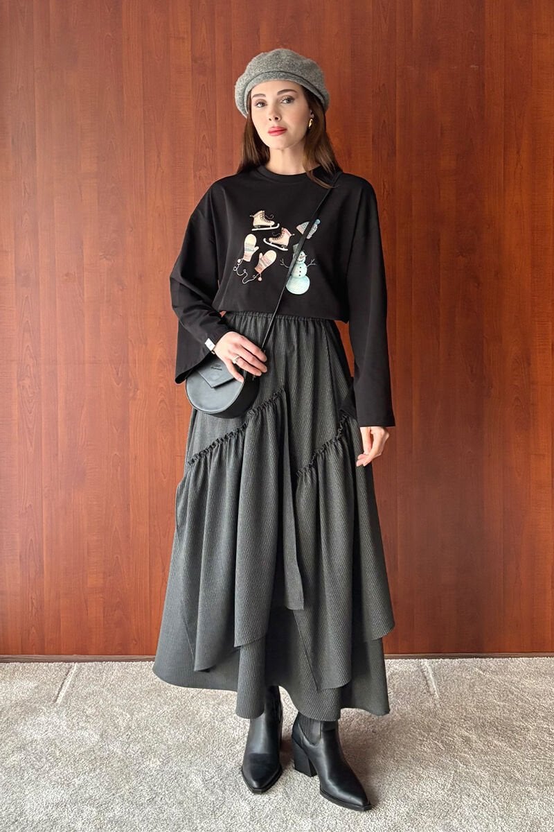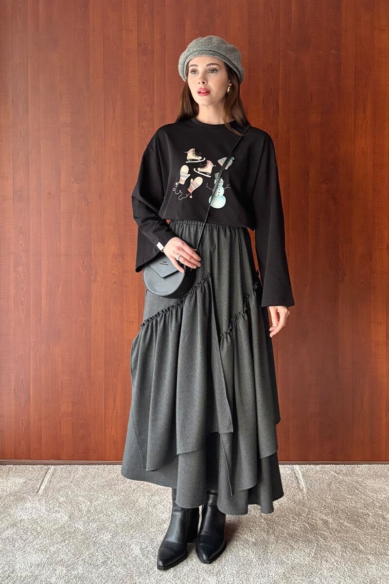 Siyah Winter Baskılı Basic Body & Antrasit Koton Bohem Kat Etek Takım