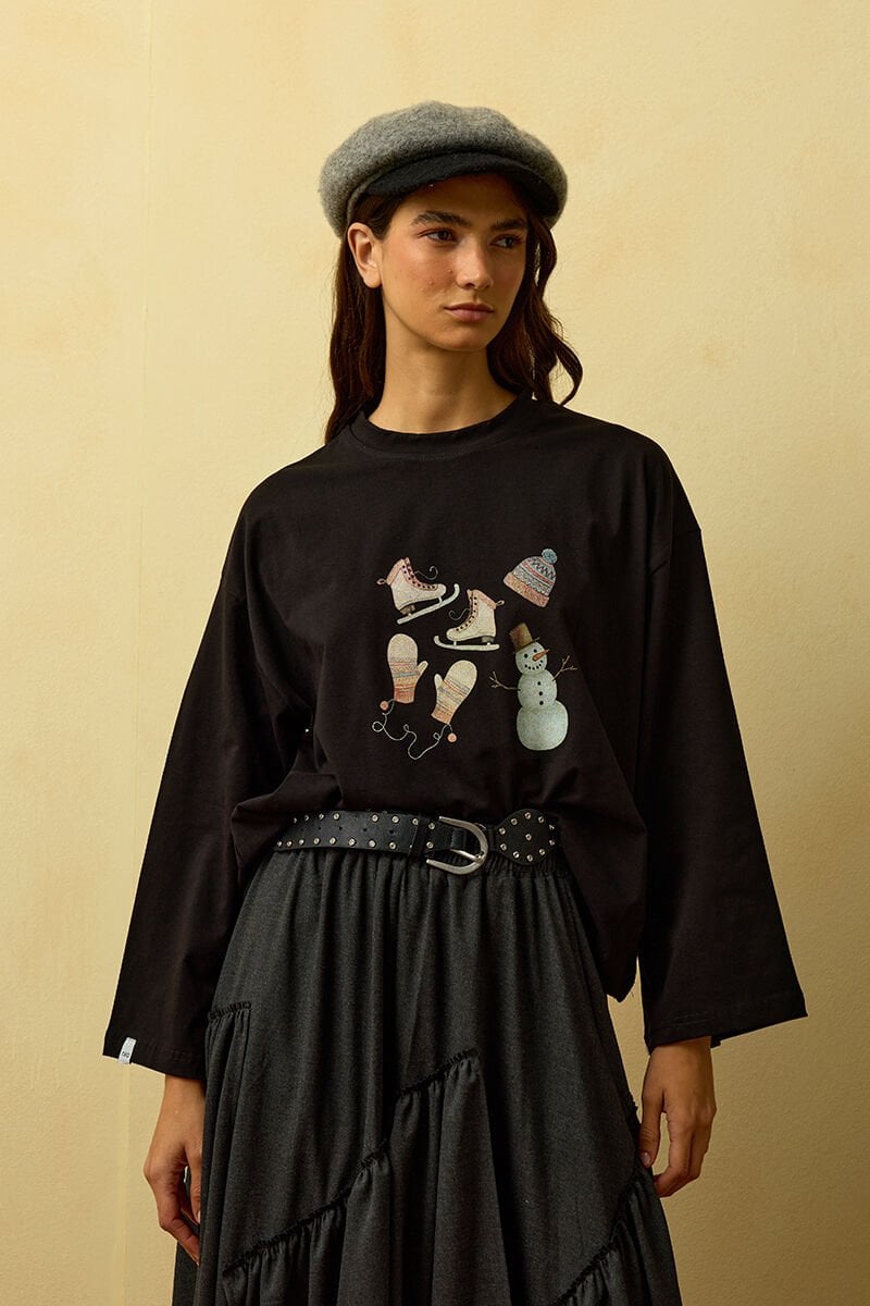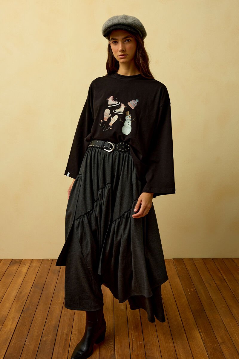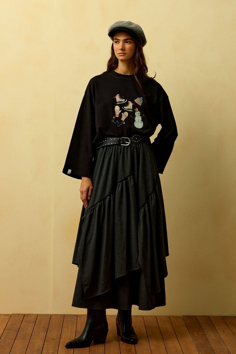 Siyah Winter Baskılı Basic Body & Antrasit Çizgili Poliviskon Bohem Kat Etek Takım