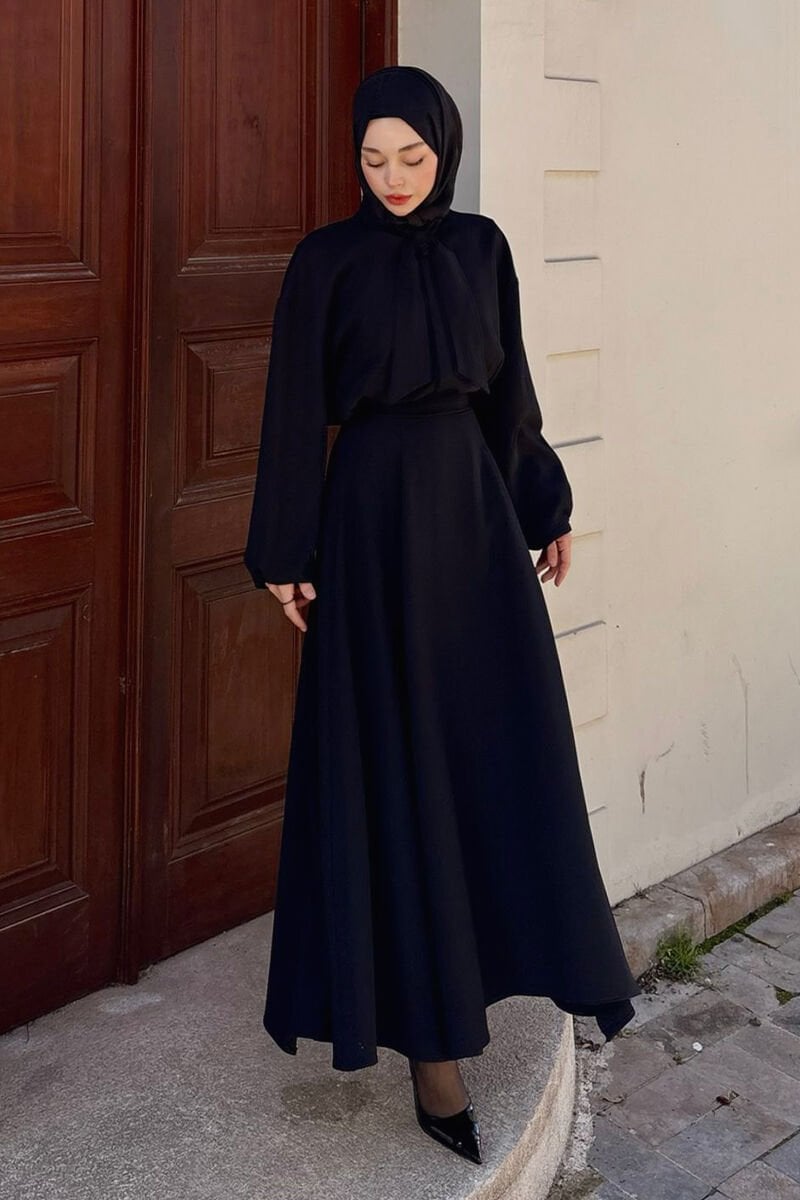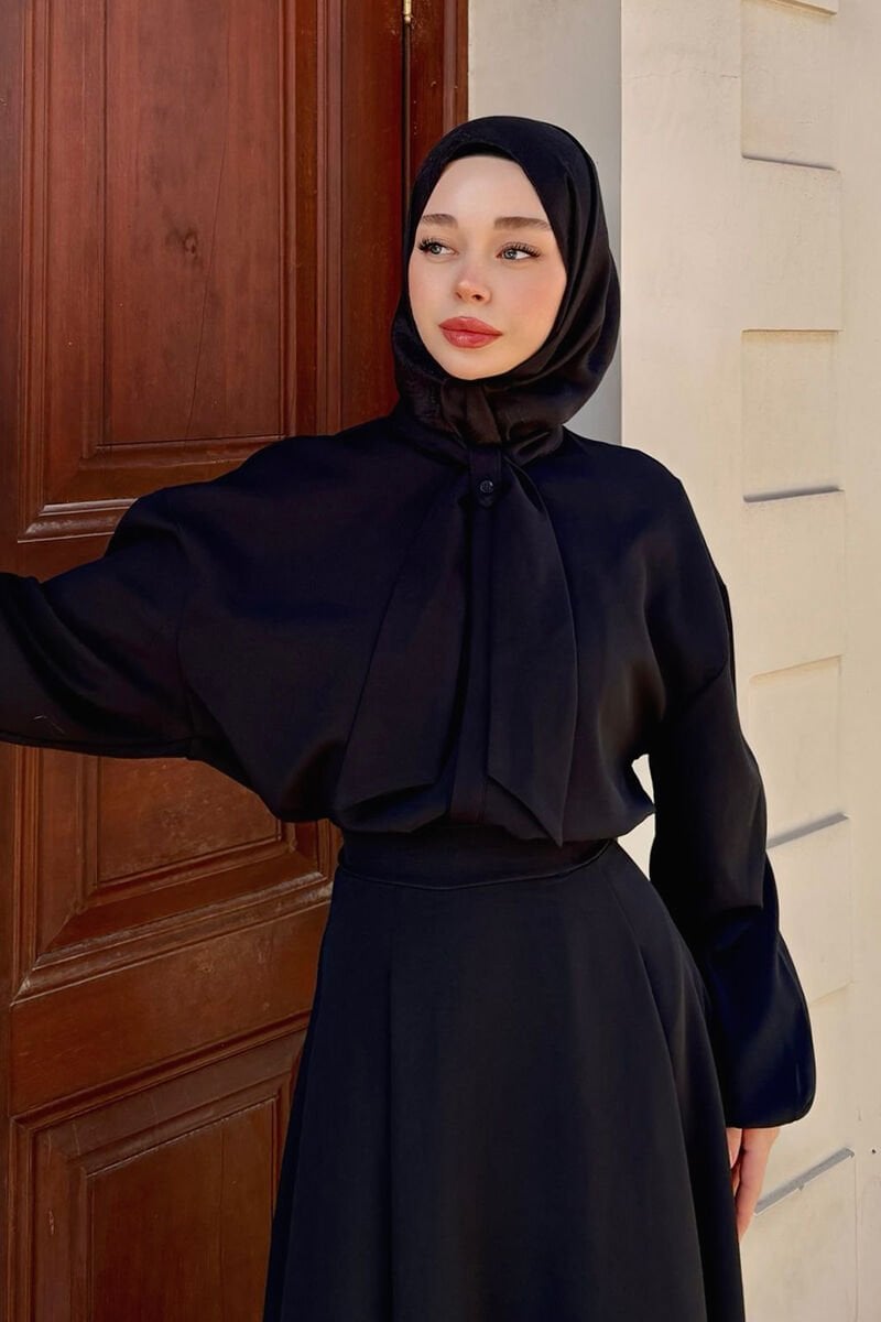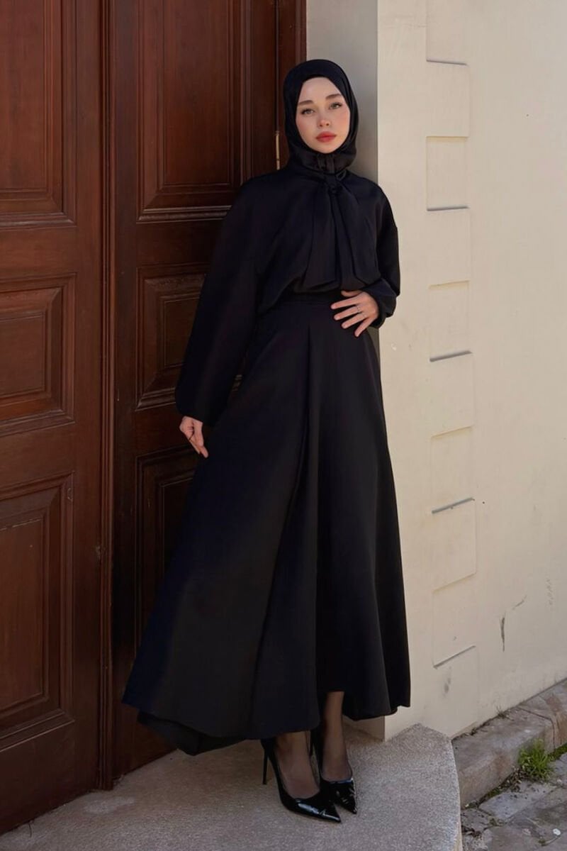 Siyah Yakası Fiyonklu Krep Gömlek & Siyah Krep İki Pileli Etek Takım