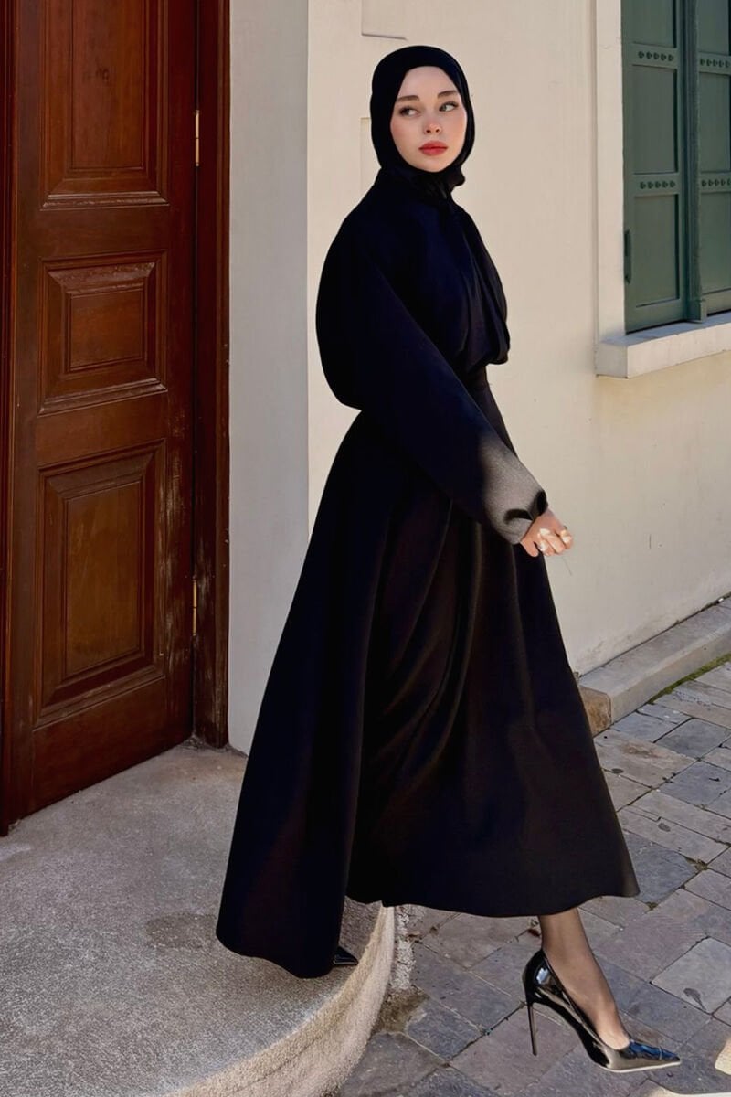 Yakası fiyonklu gömlek, zarafet katarken, kloş etek hareket özgürlüğü sağlar.