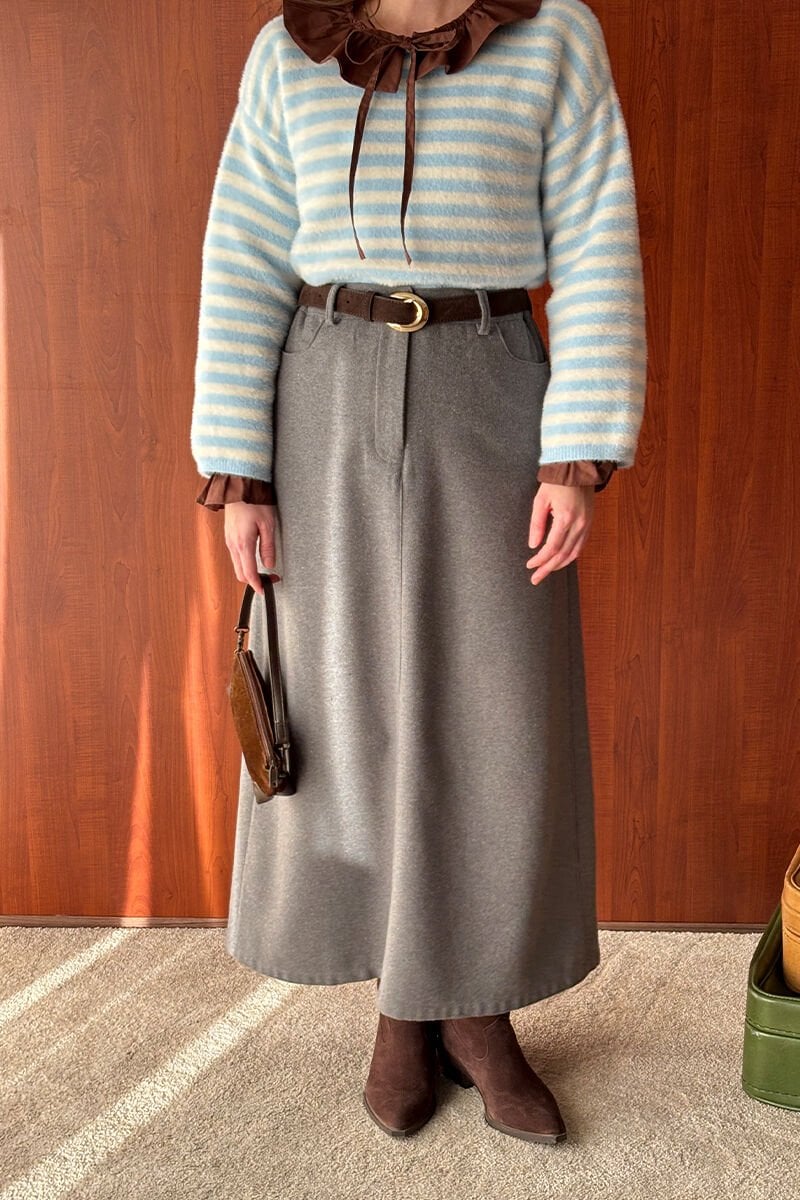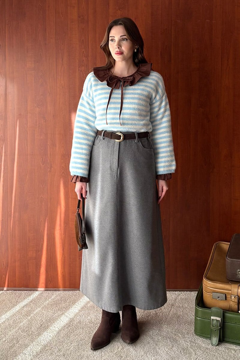 Soft Mavi Çizgili Peluş Kazak & Antrasit Kaşe Kalem Etek Takım