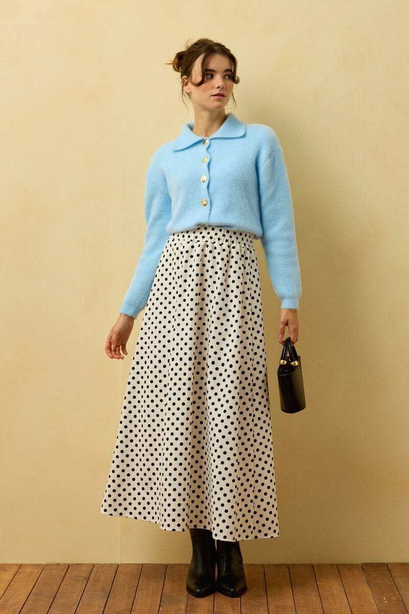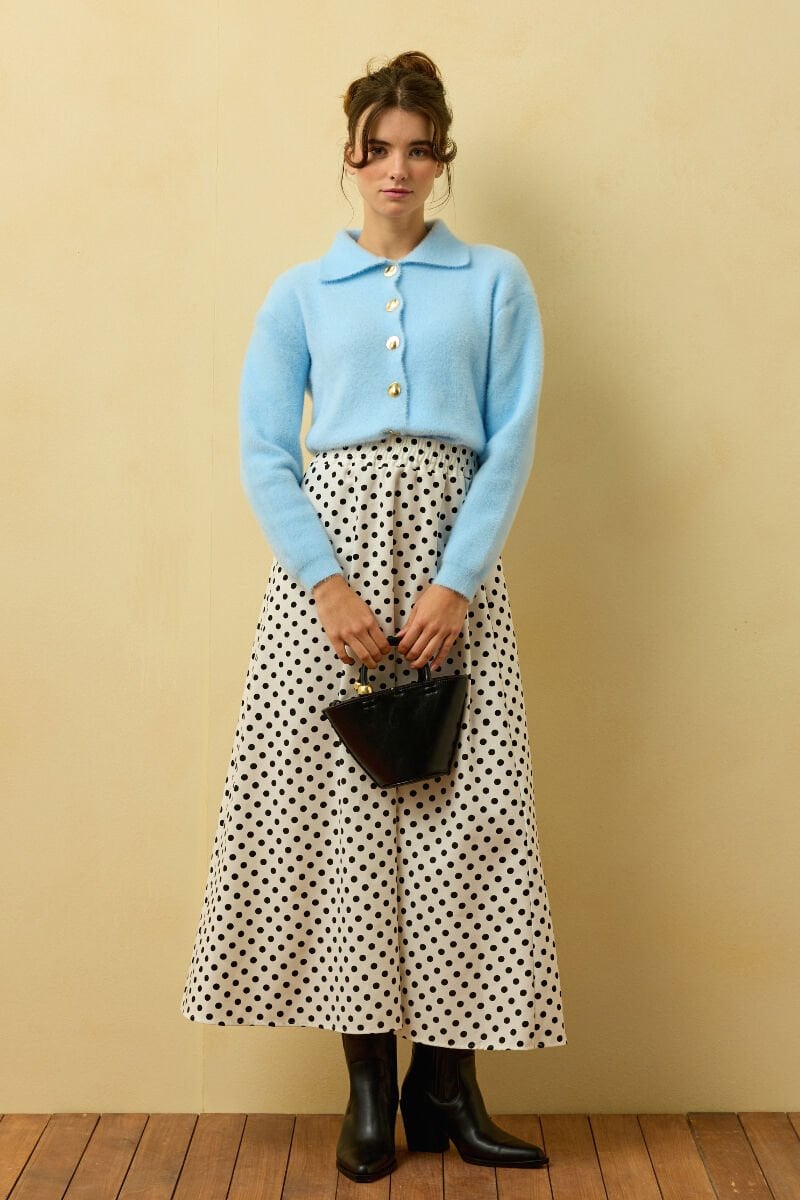Soft Mavisi Polo Yaka Peluş Hırka & Beyaz Siyah Puantiyeli Keten Kloş Etek Takım