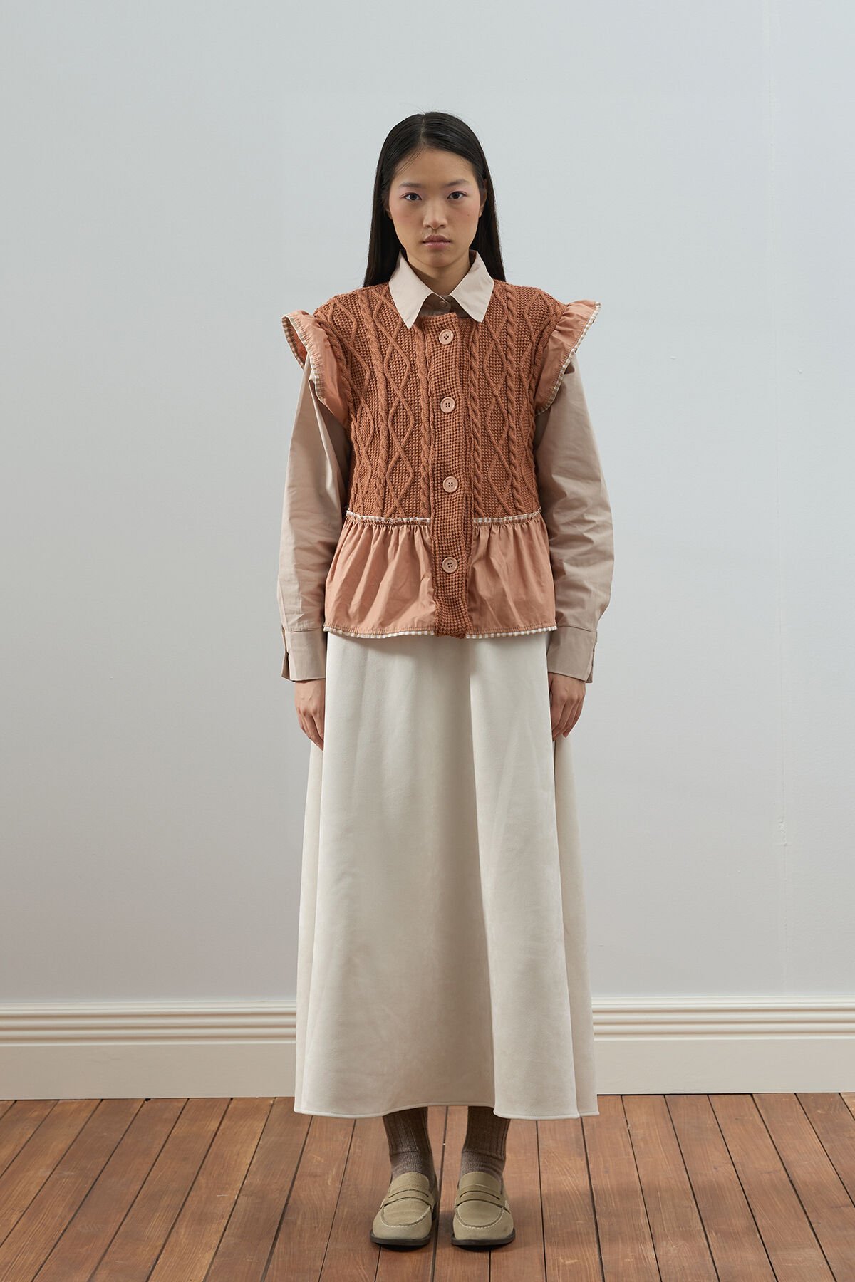 Bu fırfırlı triko yelek, hem şık hem de rahat bir görünüm sunar.