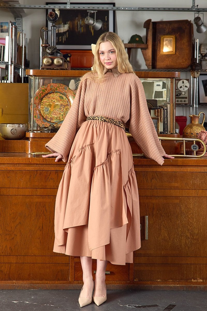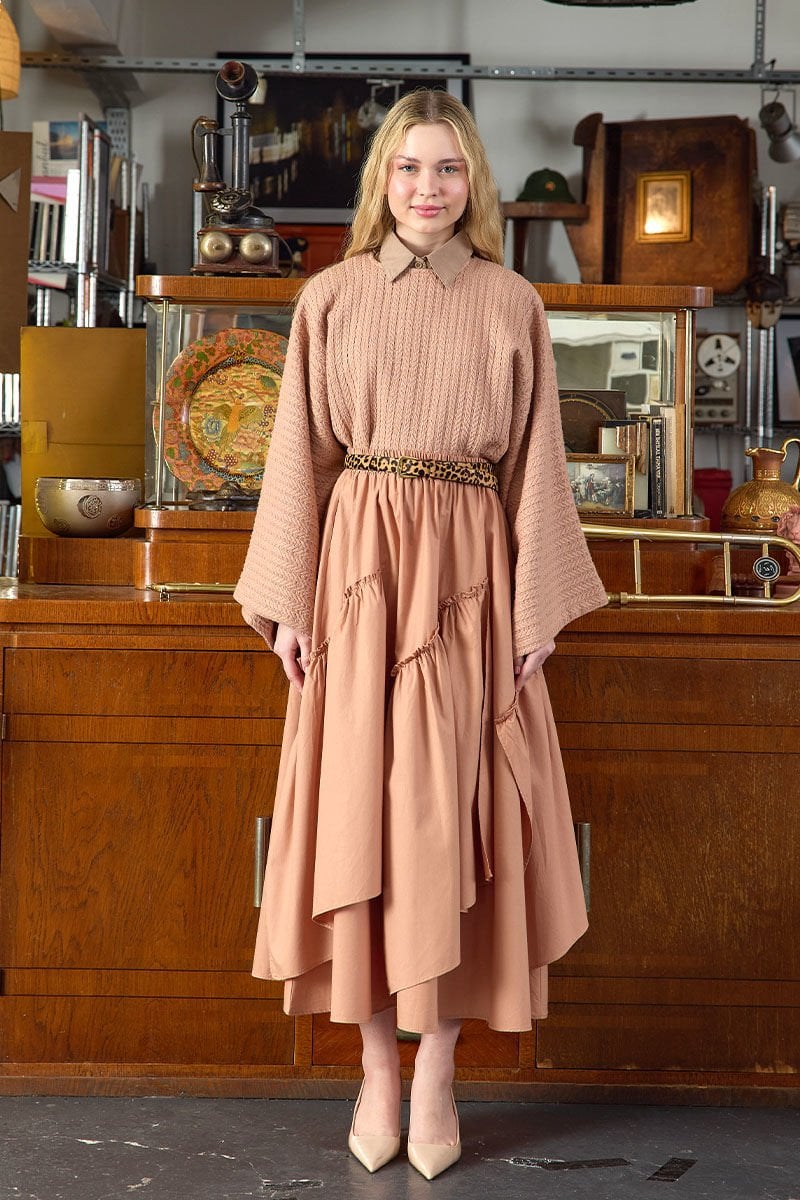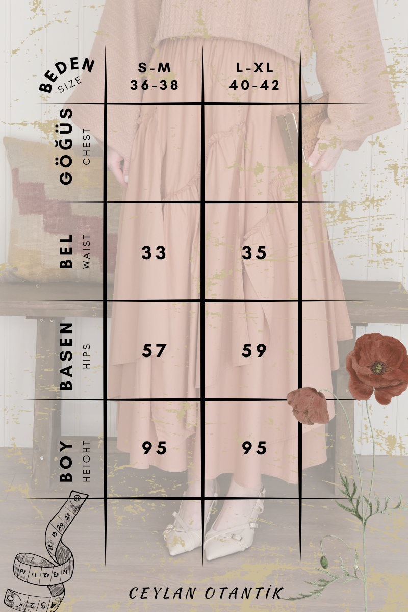 Rahat, hafif ve şık bir görünüm sunan bu etek, kat detayları ile dikkat çekiyor.