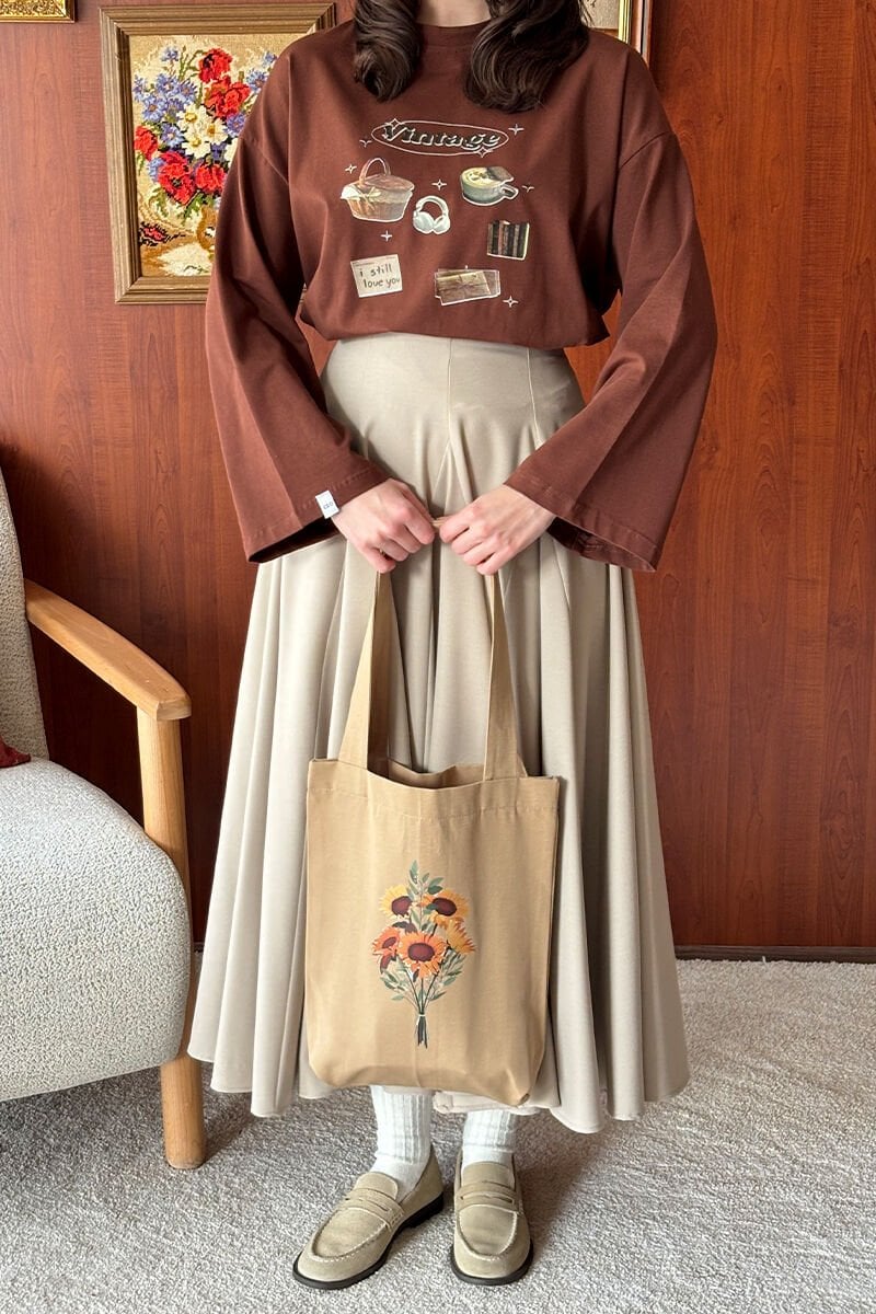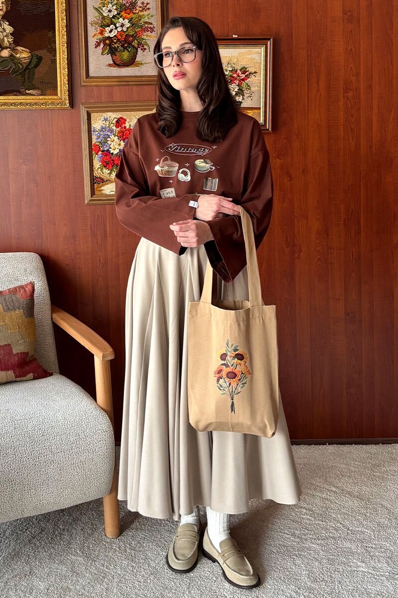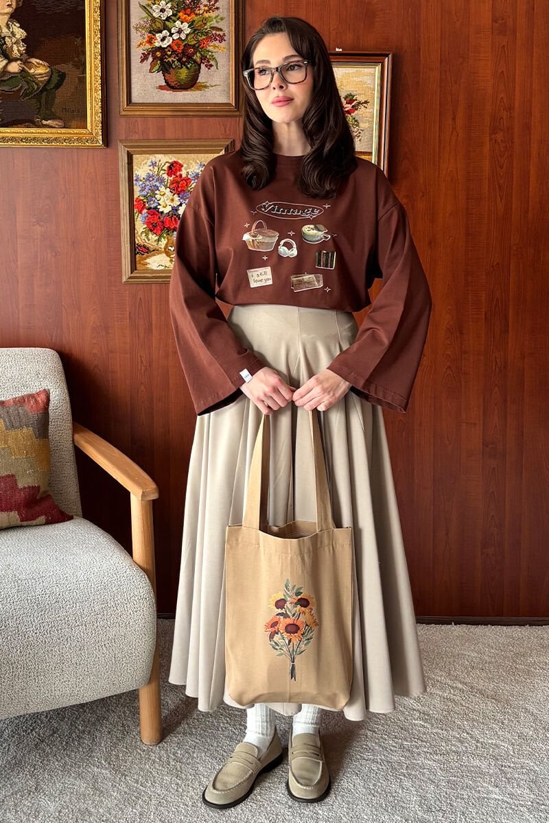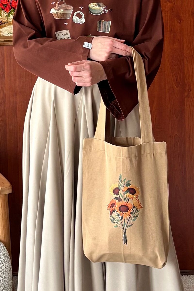 Sütlü Kahve Ay Çiçeği Baskılı Keten Çanta