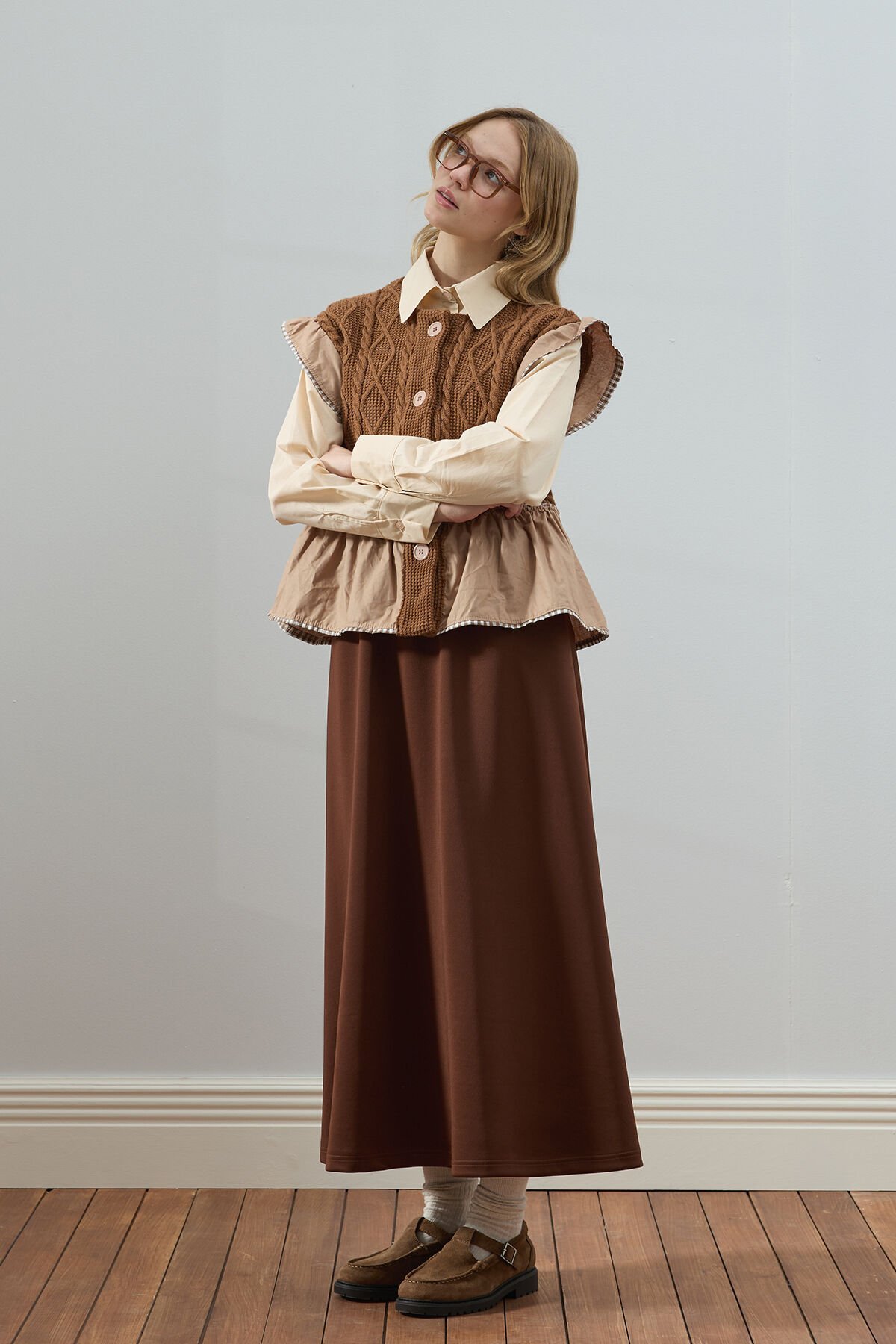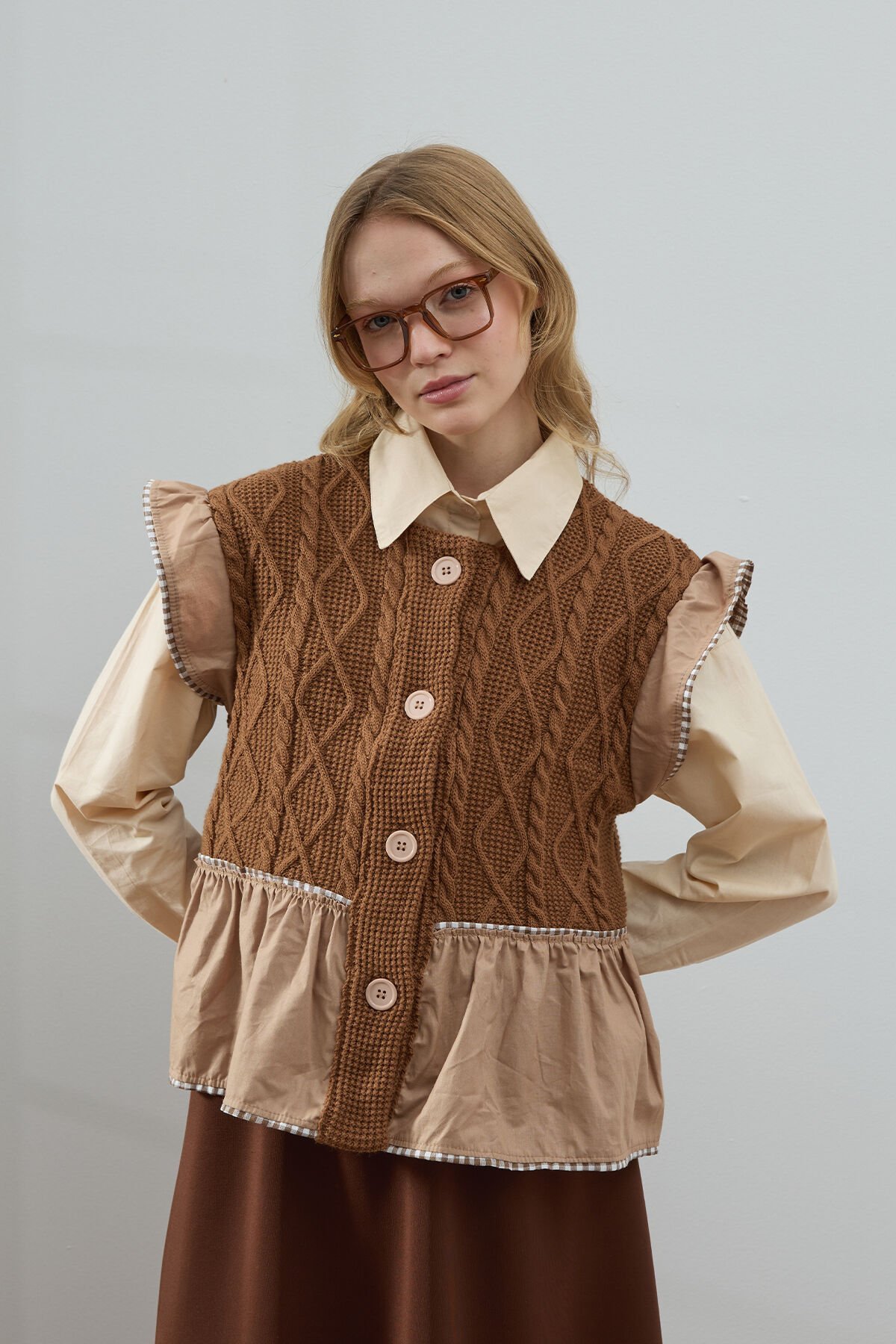 Sütlü Kahve Fırfırlı Triko Yelek