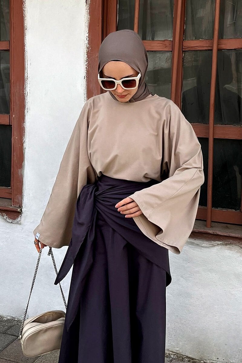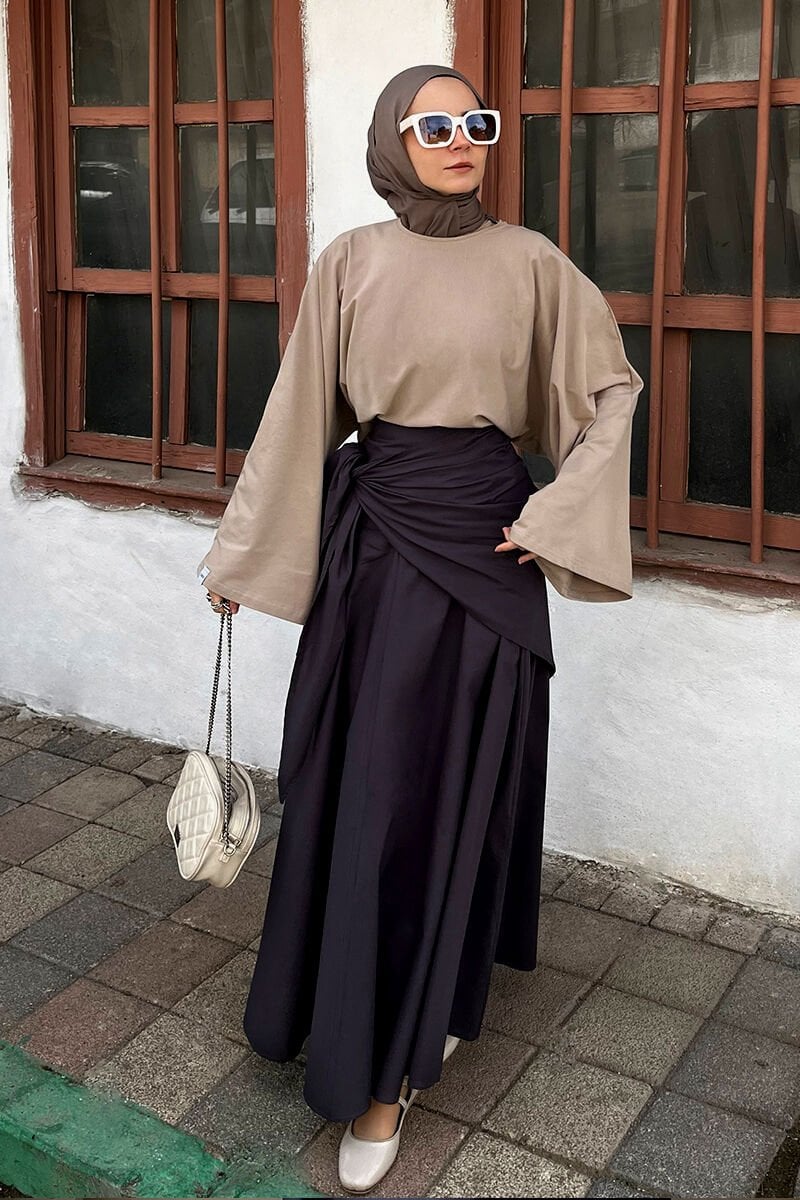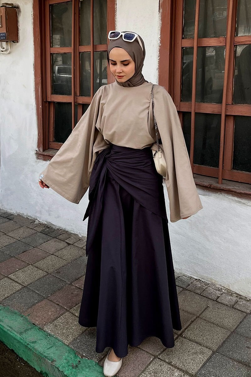 Taş Süprem Yarasa Kol Crop & Siyah Bağlamalı Pamuk Etek