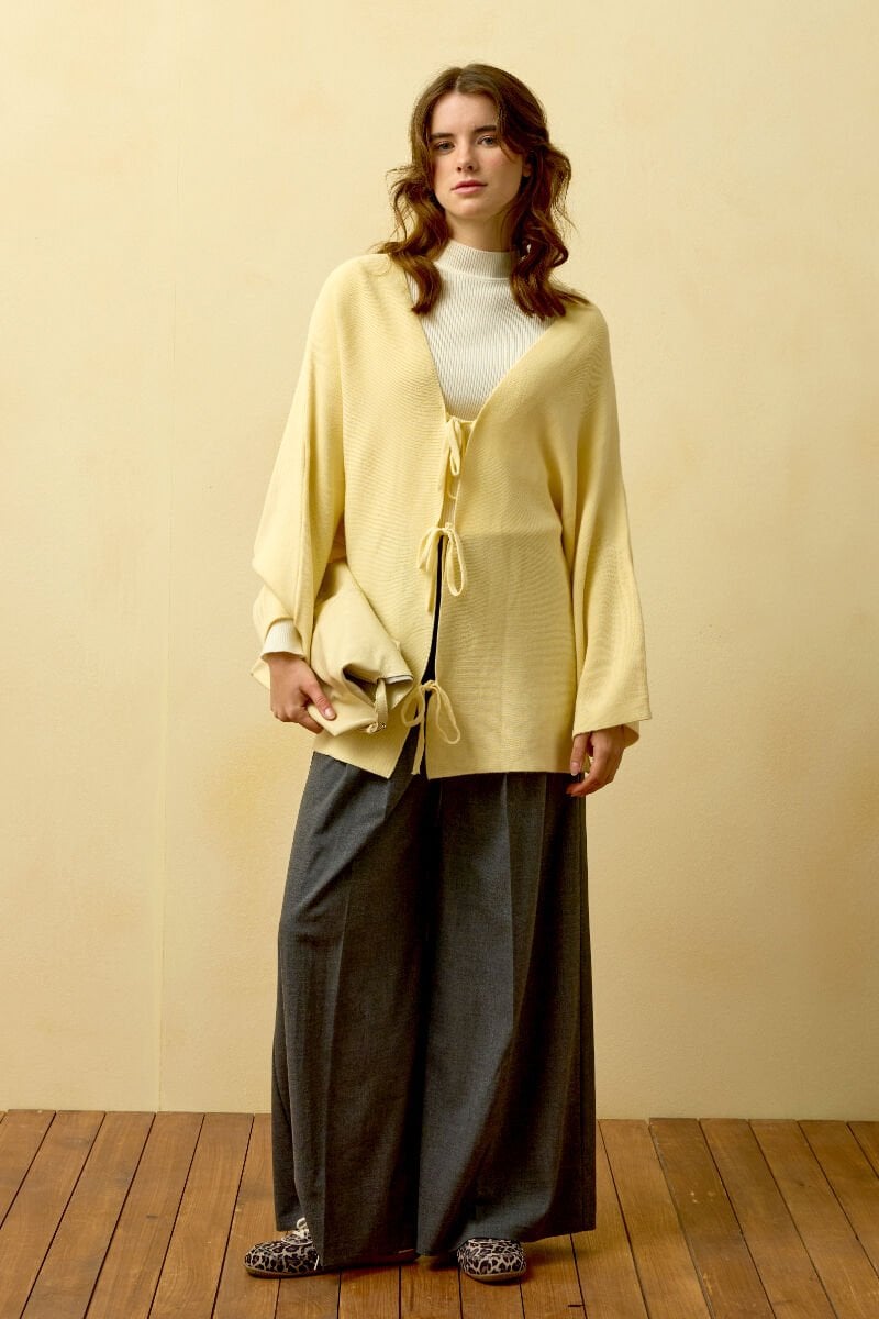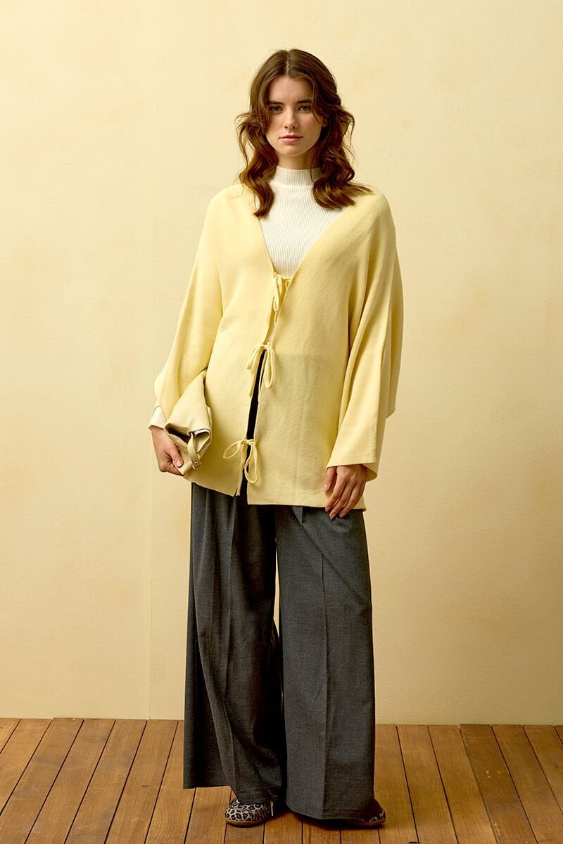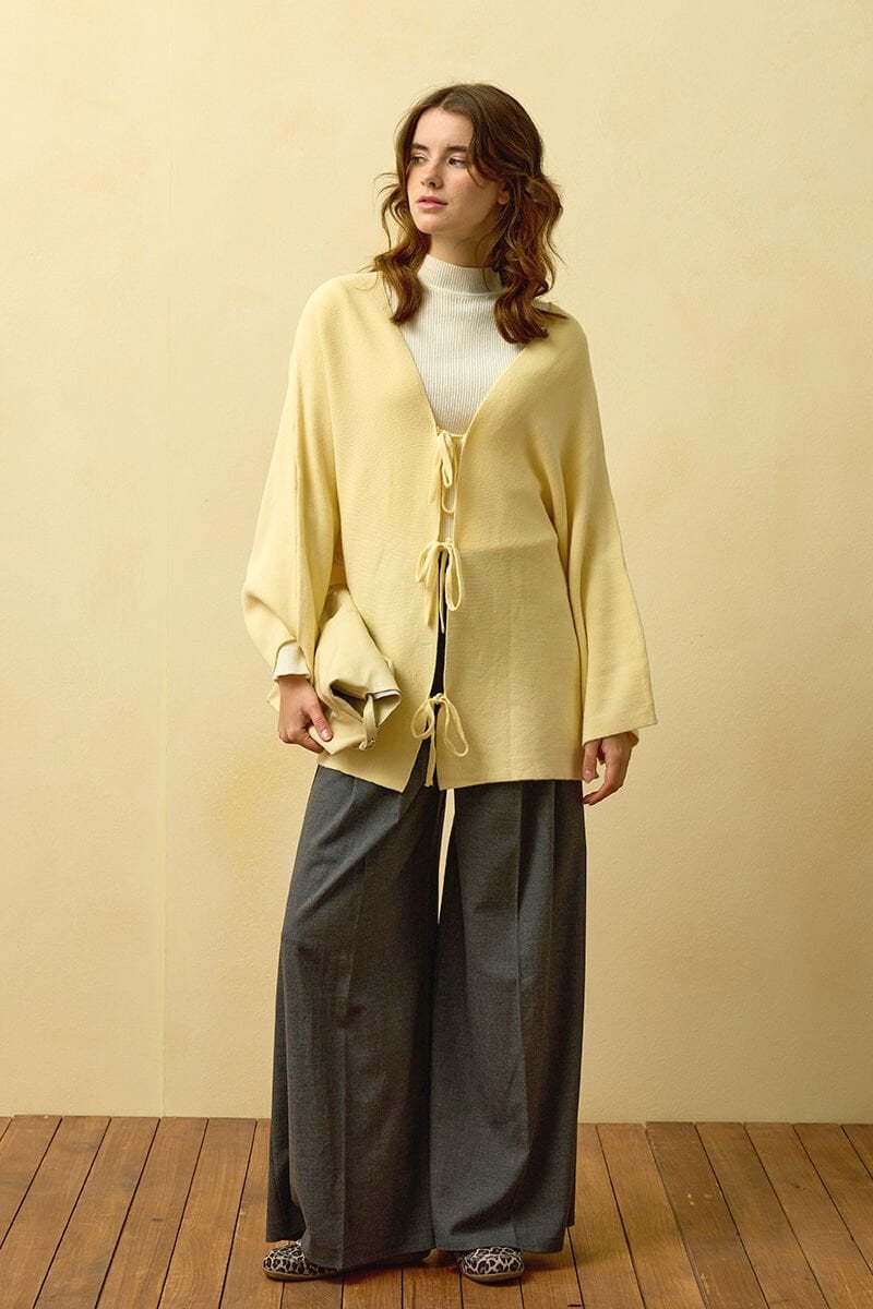 Tereyağ Sarısı 3 Fiyonklu Triko Ceket & Antrasit Pile Detay Palazzo Pantolon