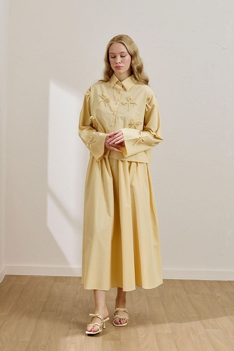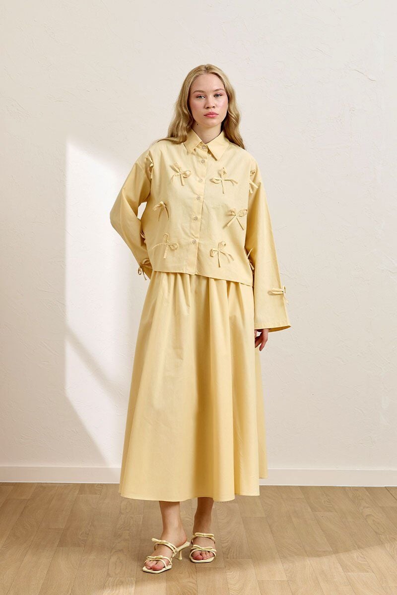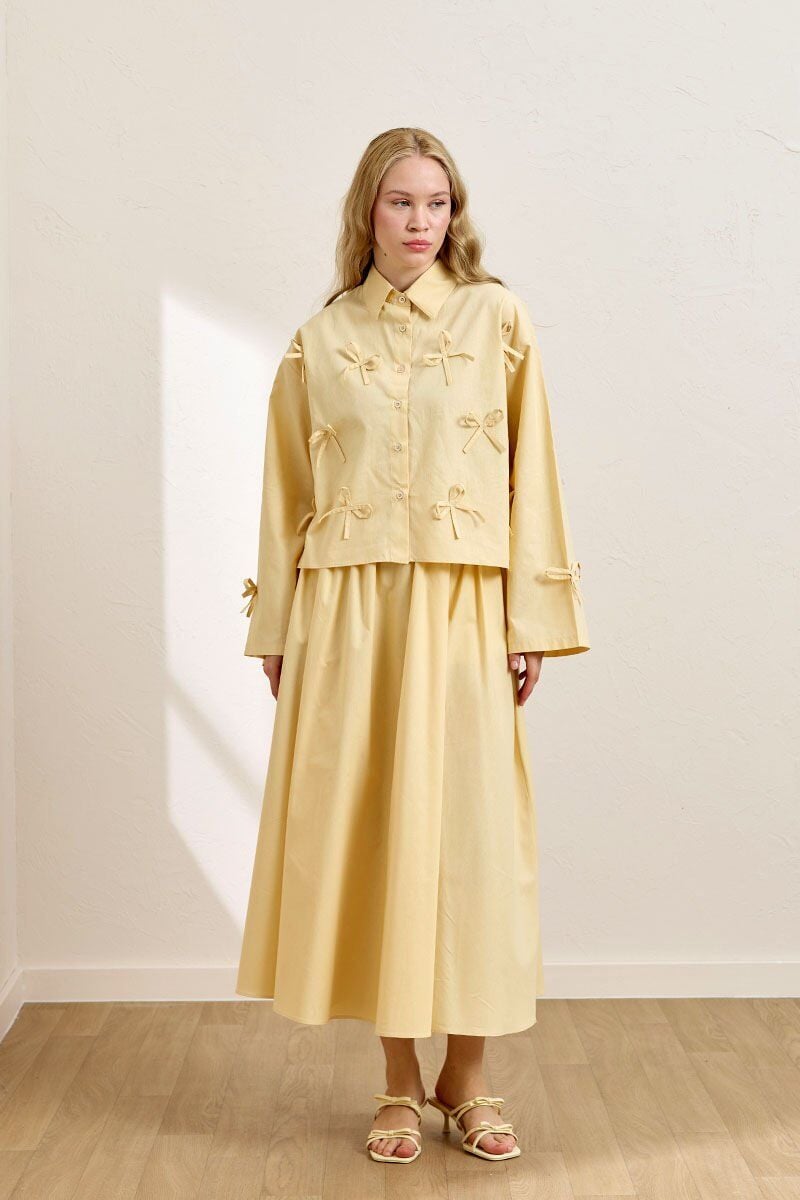 Fiyonk detaylı crop gömlek ve balon etek kombinasyonuyla dikkat çekici bir görünüm elde edebilirsin.