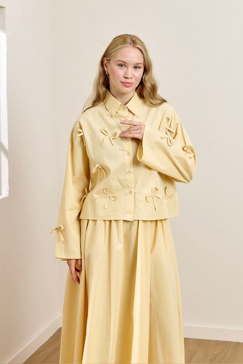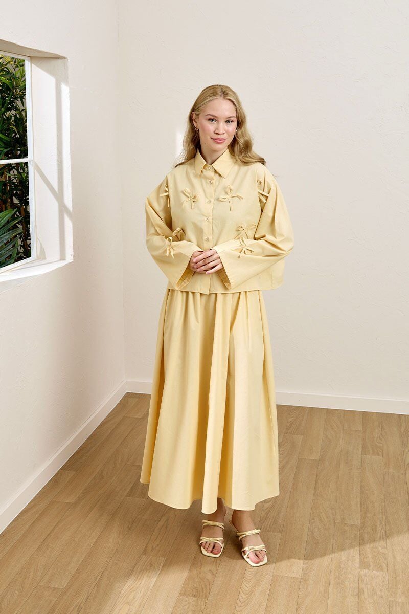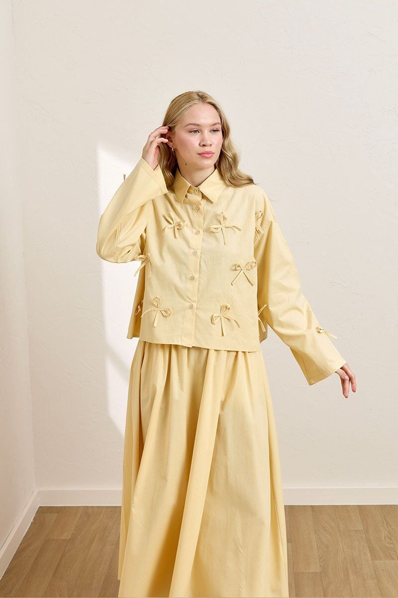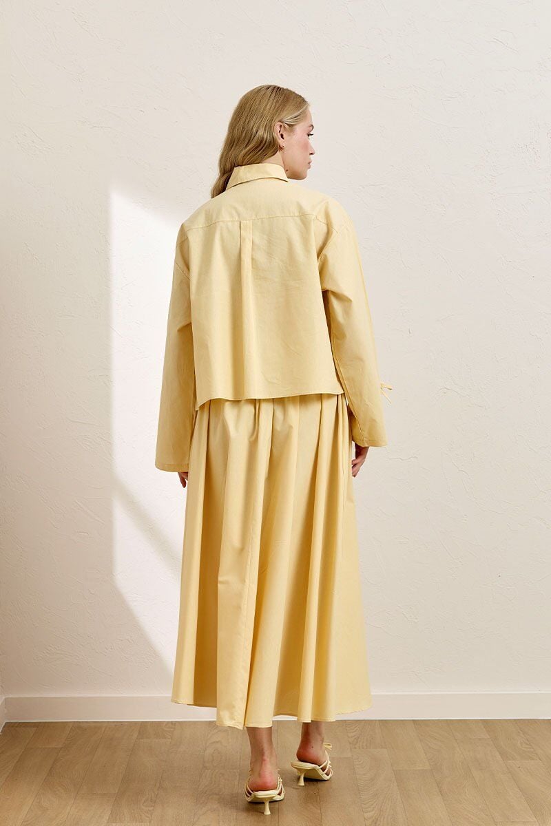 Fiyonk detaylı crop gömlek ve balon etek kombinasyonuyla dikkat çekici bir görünüm elde edebilirsin.