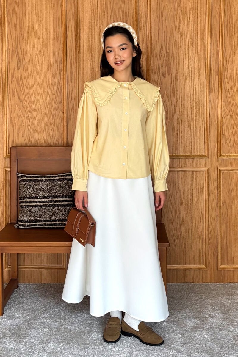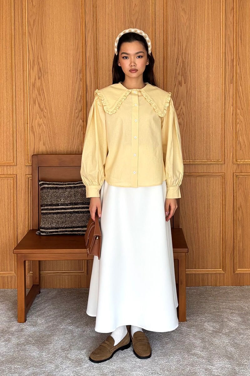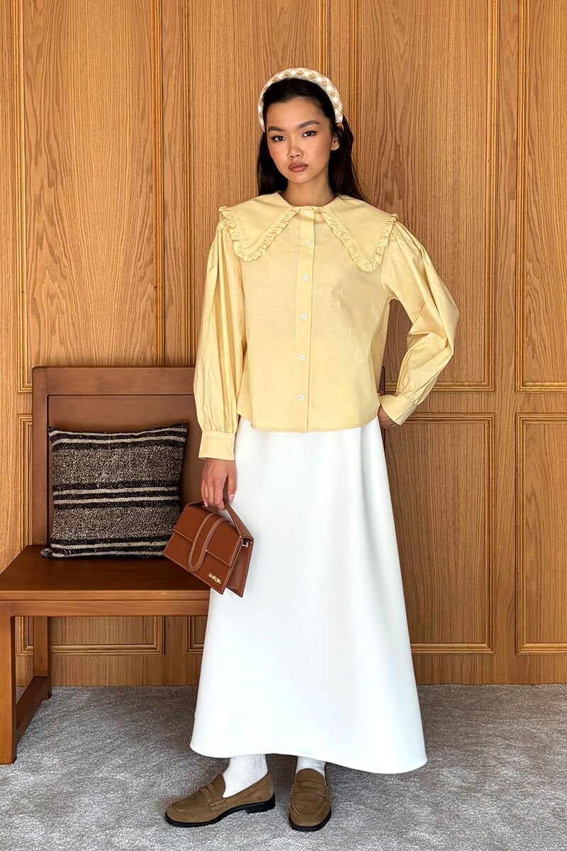 Tereyağ Sarısı Yakası Fırfırlı Crop Gömlek & Ekru Scuba Etek Takım