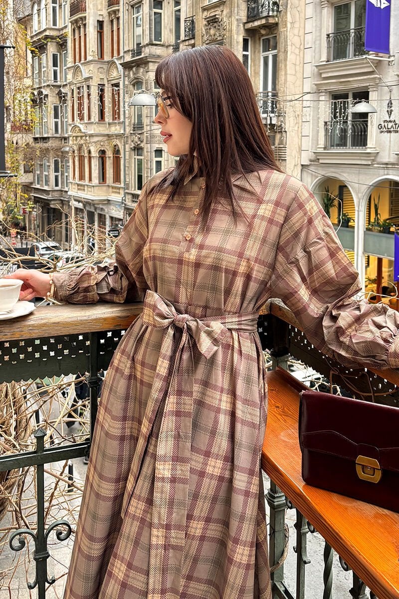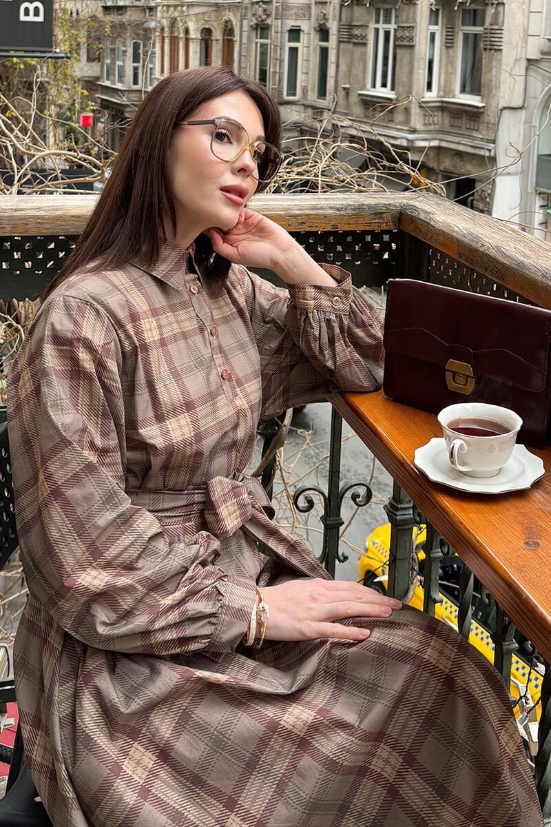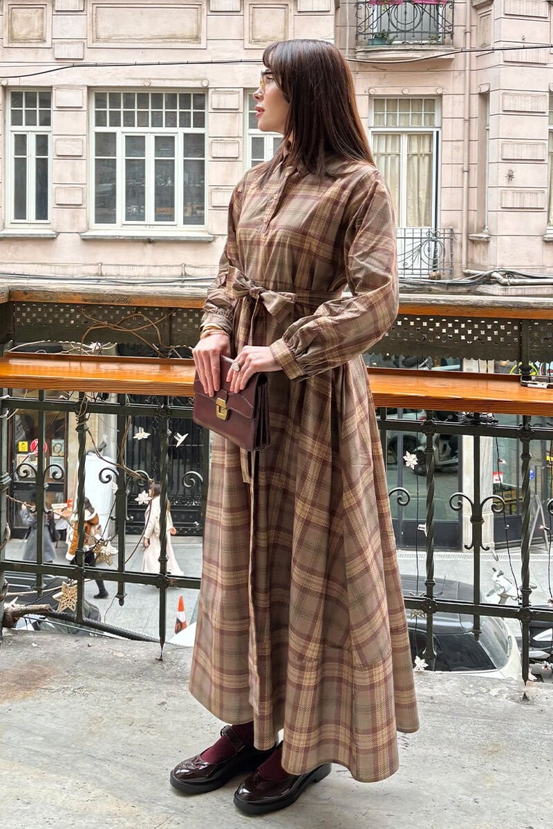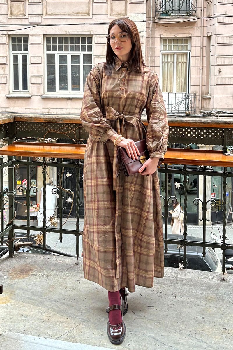 Şık ve zamansız ekose desenli elbisemiz, düğme detaylarıyla dikkat çekiyor.