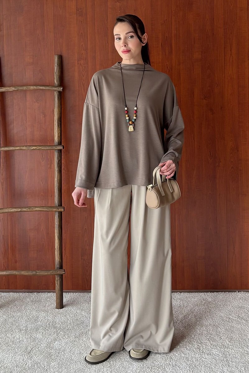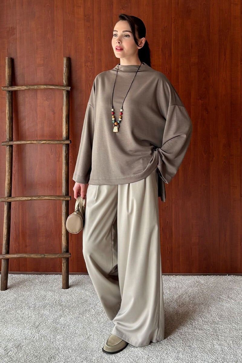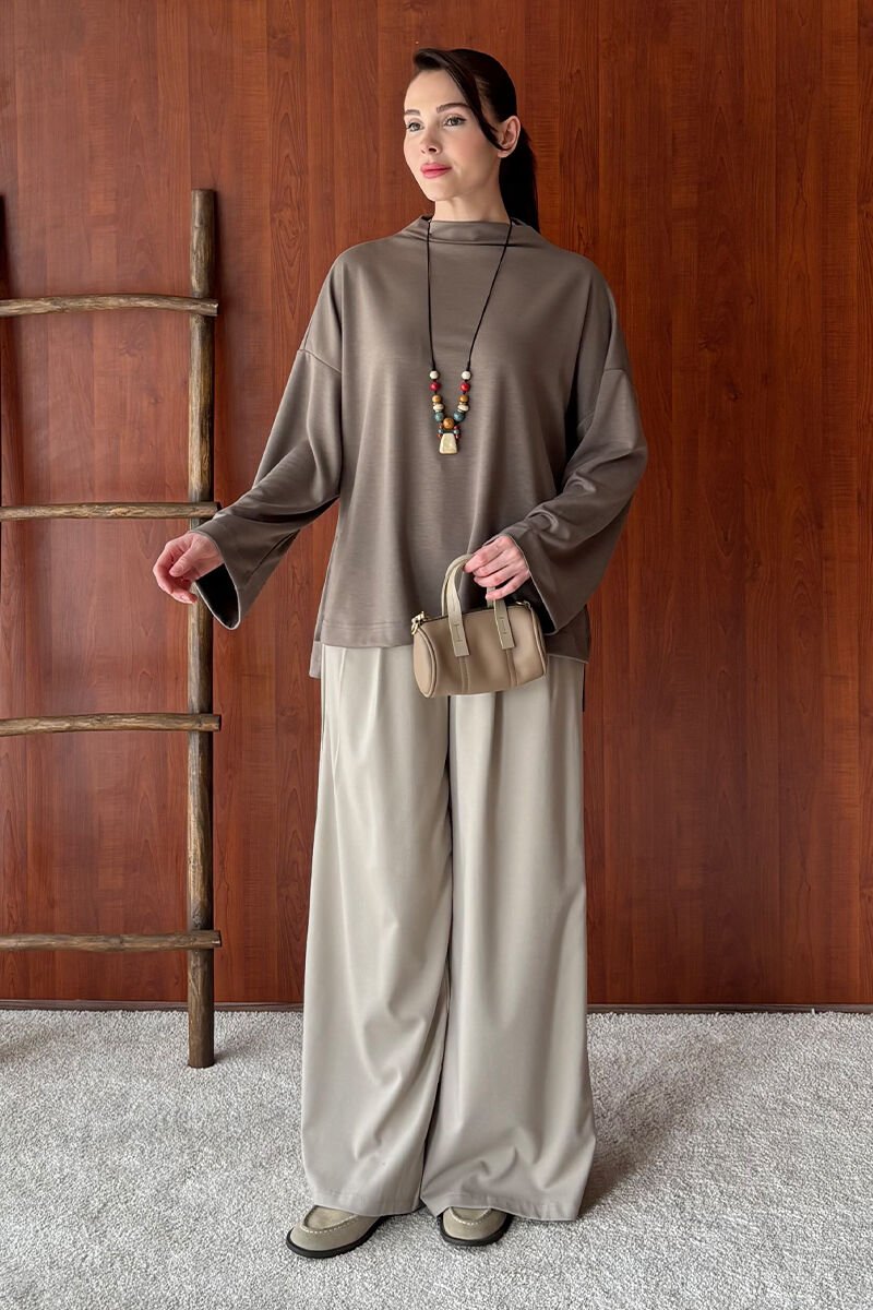 Vizon Oysho Dik Yaka Bluz & Vizon Pile Detay Palazzo Pantolon